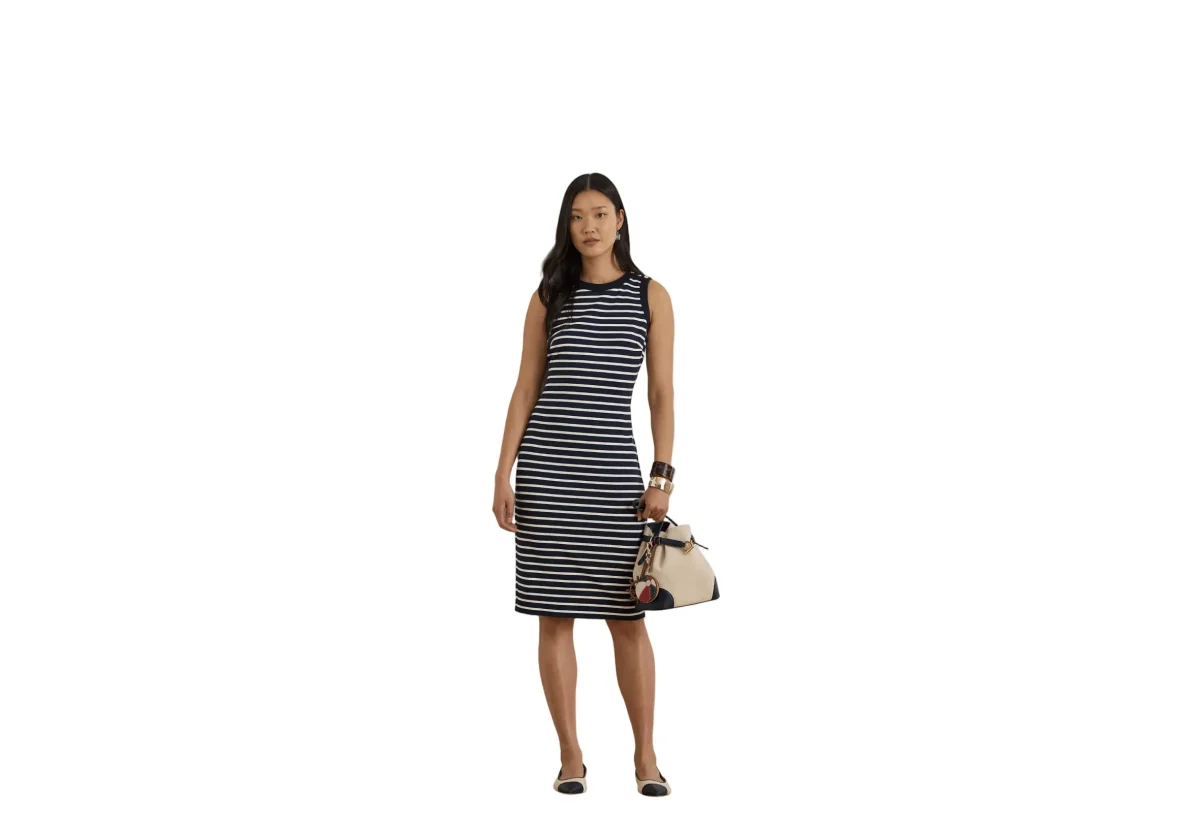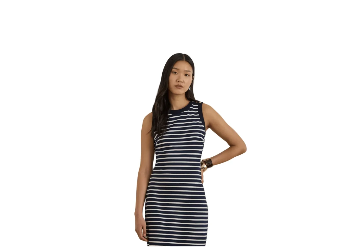 Modello: 200P09091001 Silhouette a tubino. Girocollo. Cerniera centrale posteriore nascosta con chiusura a gancio. Tre bottoni automatici in metallo dorato sviluppati su misura con un logo โLRLโ su ogni spalla.