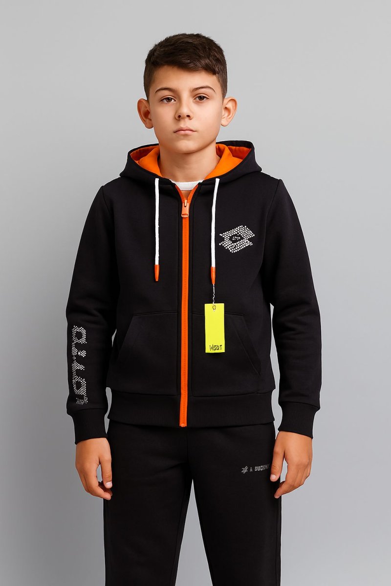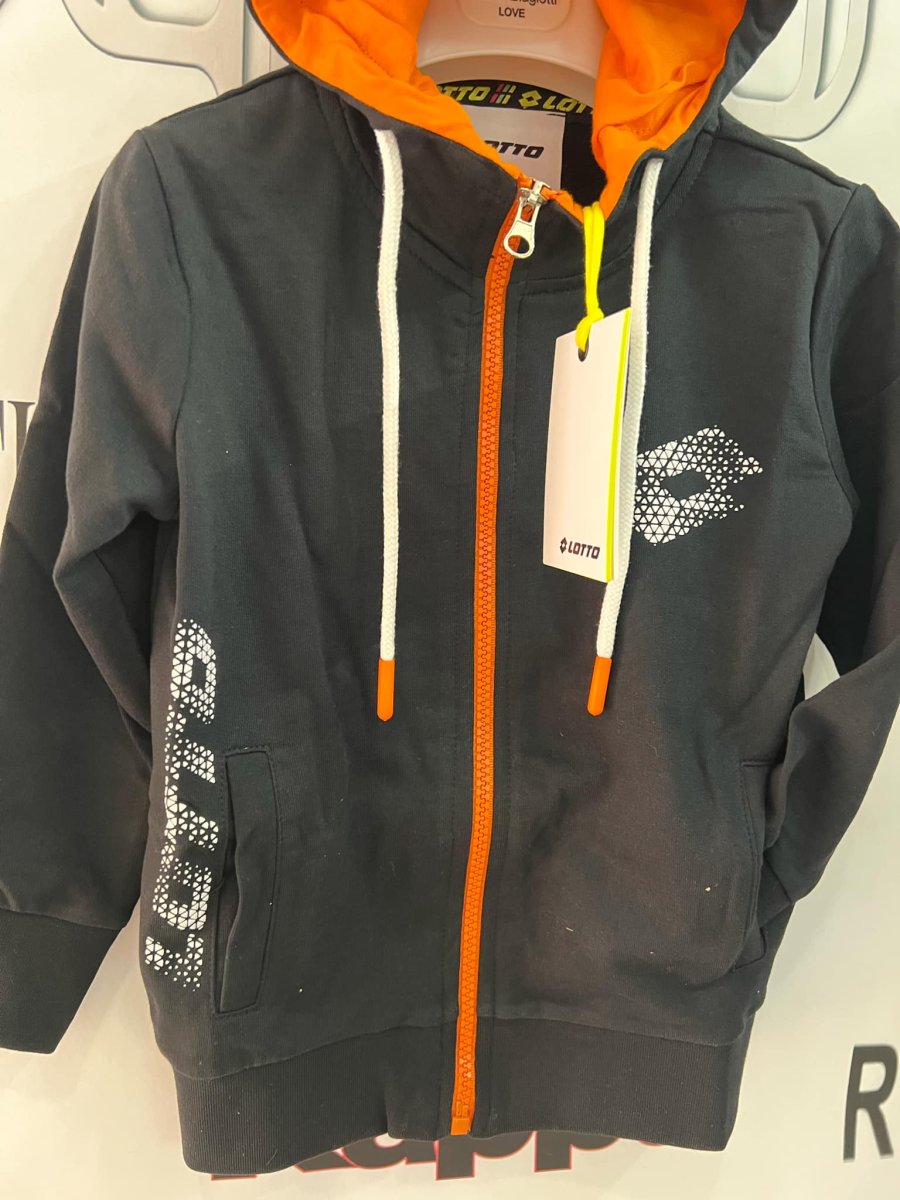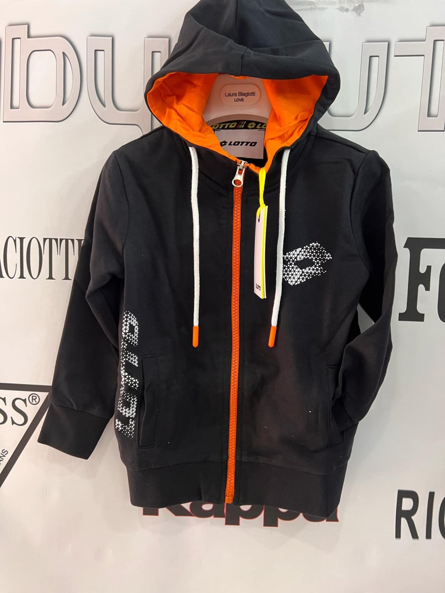 LOTTO FELPA LOTTO FELPA con zip e cappuccio. logo. tasca taglia: 4 anni alla 18 anni Composizione: cotone Colore: nero/arancio