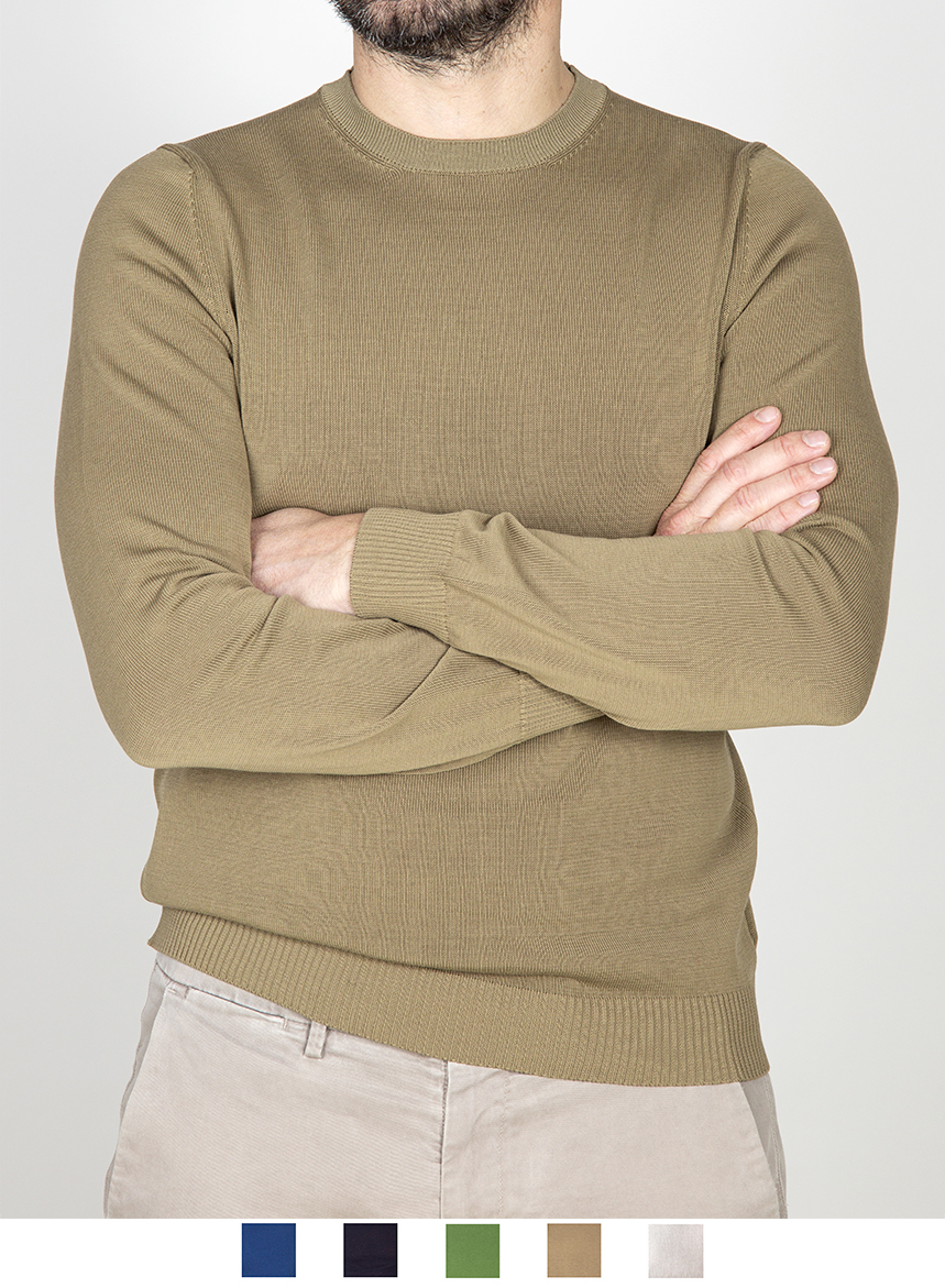 Maglione da uomo con scollo a giro e manica lunga in Cotone Crèpe, alta qualità, Long-Staple. Il modello indossa una Taglia 48 ed è alto 175 cm. Se non è disponibile la tua taglia scrivici a [email protected] o rivolgiti al nostro personale in Boutique. Se avremo disponibilità di filato, produrremo per te la tua maglia.