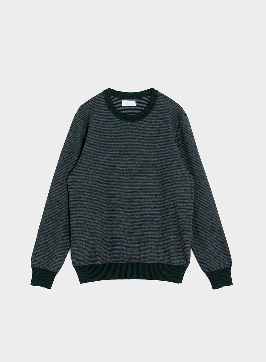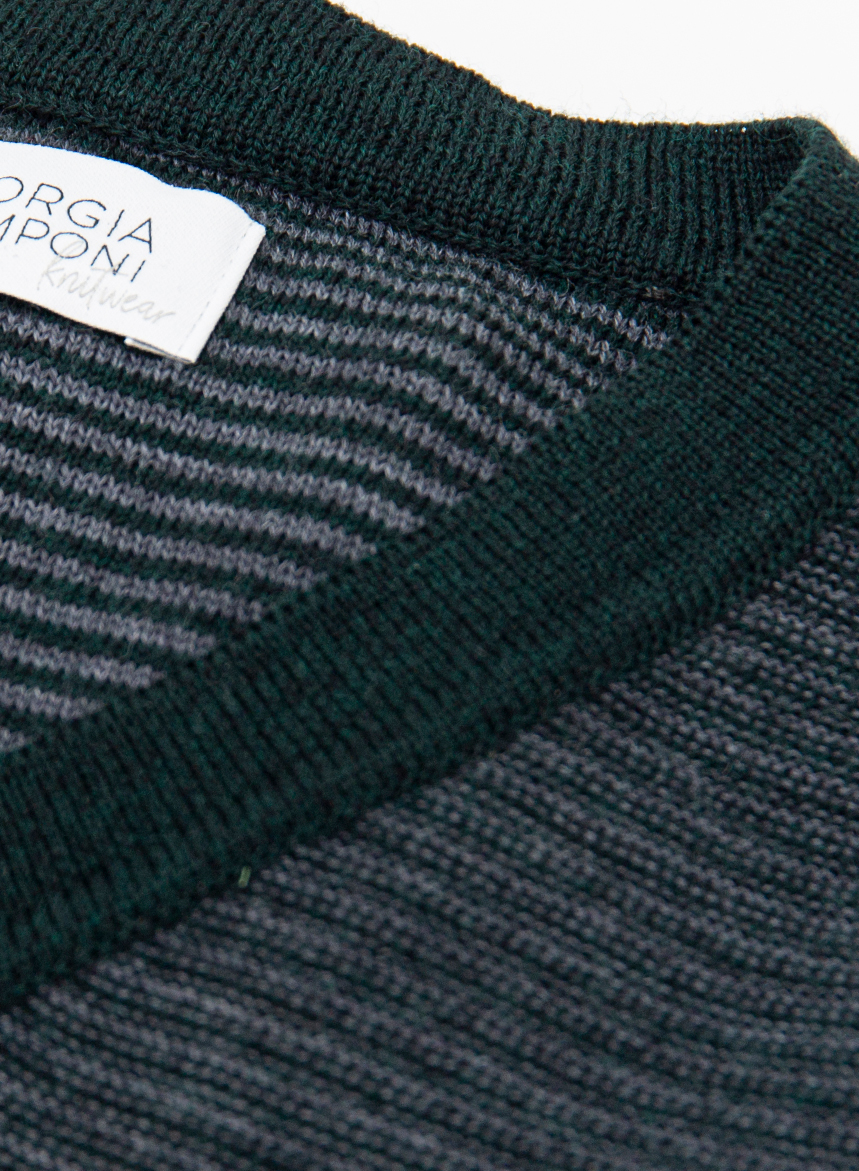 Maglione rigato a due colori, con scollatura a giro in pura lana merinos extrafine certificata RWS. Spessore di maglia medio con maniche lunghe ed inizi alti in costa. Vestibilitร Regular fit. Se non รจ disponibile la tua taglia scrivici a [email protected] o rivolgiti al nostro personale in Boutique. Se avremo disponibilitร di filato, produrremo per te la tua maglia.