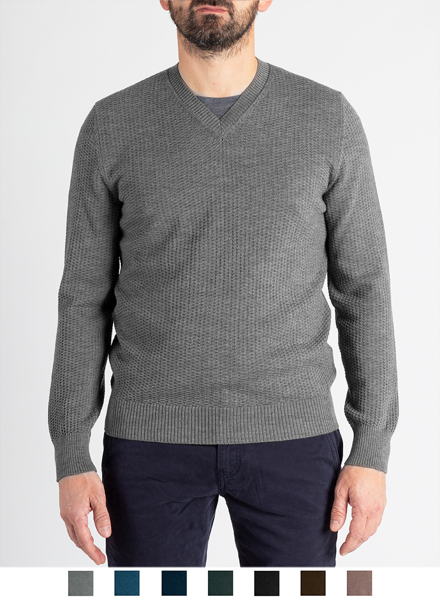 Maglione lavorato a grana di riso con con scollatura a V in pura lana merinos extrafine certificata RWS. Spessore di maglia medio con maniche lunghe ed inizi alti in costa. Vestibilitร Regular fit. Il modello indossa una Taglia 48 ed รจ alto 175 cm. Se non รจ disponibile la tua taglia scrivici a [email protected] o rivolgiti al nostro personale in Boutique. Se avremo disponibilitร di filato, produrremo per te la tua maglia.