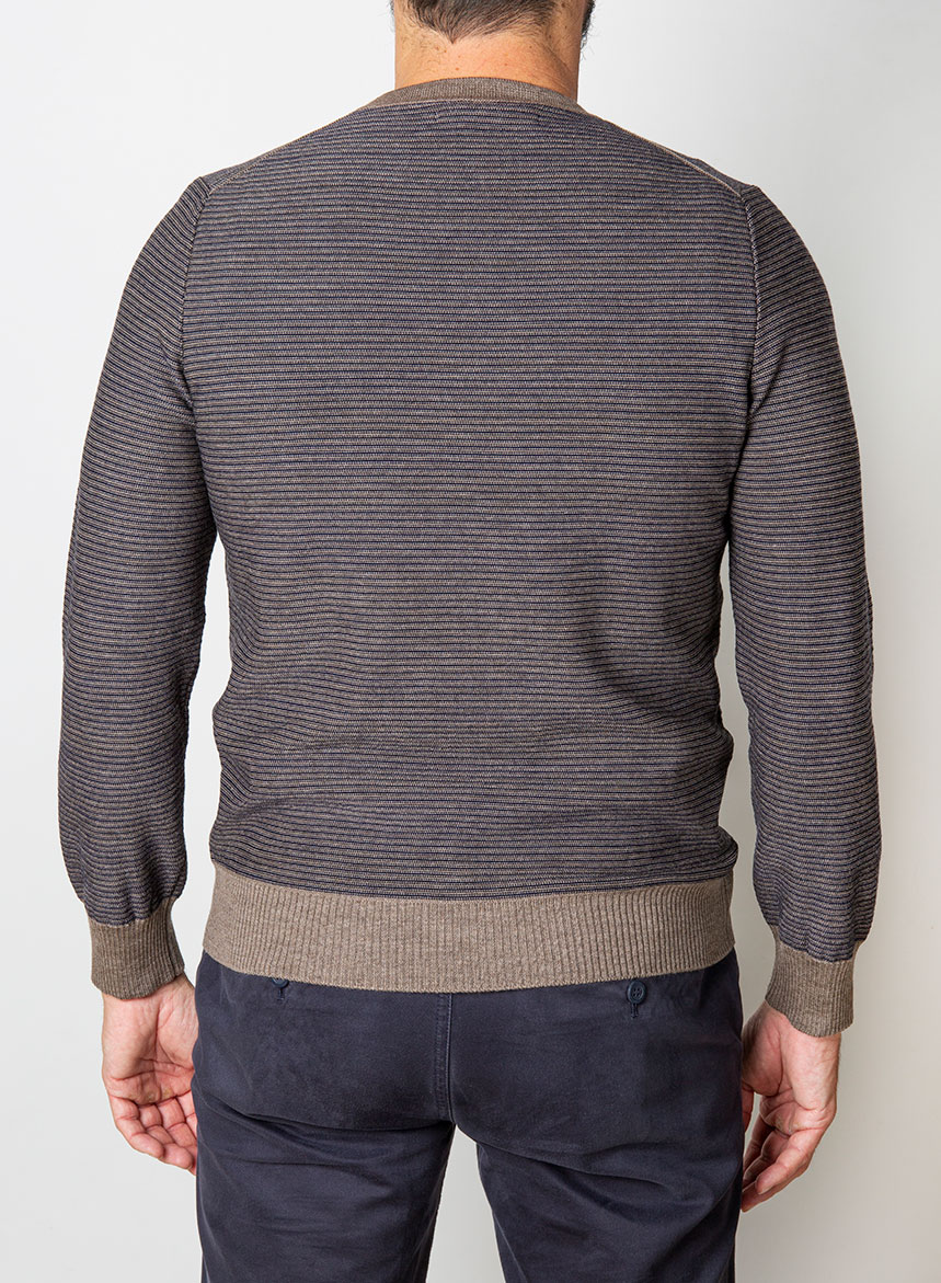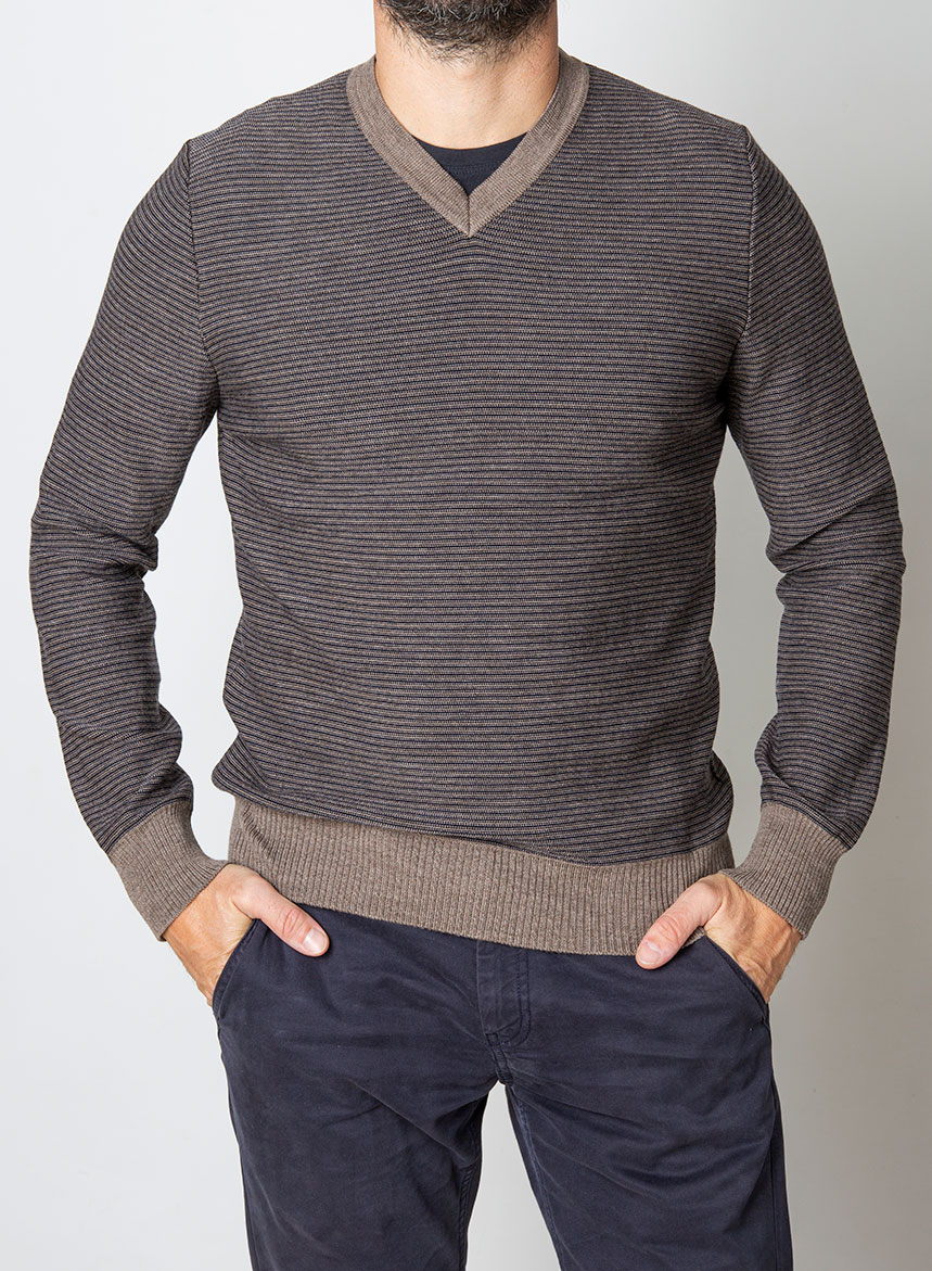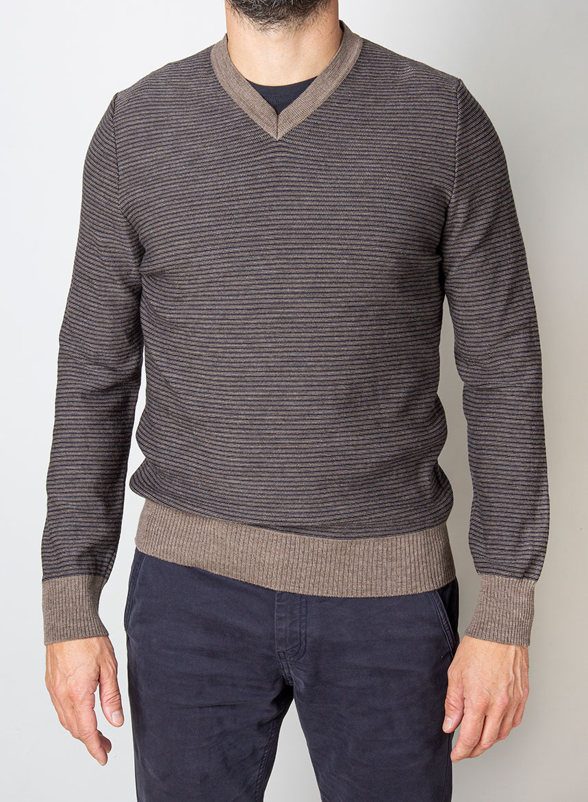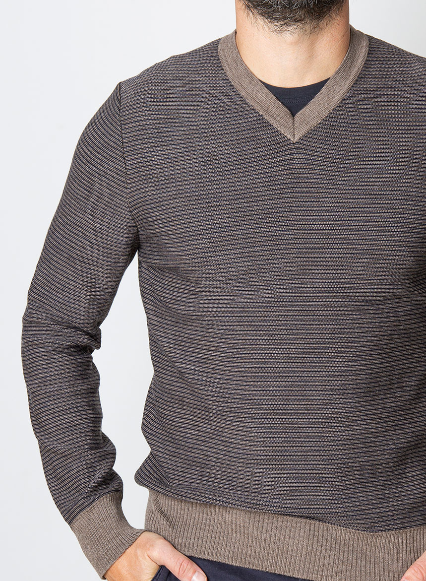 Maglione rigato a due colori, con scollatura a V in pura lana merinos extrafine certificata RWS. Spessore di maglia medio con maniche lunghe ed inizi alti in costa. Vestibilitร Regular fit. Il modello indossa una Taglia 48 ed รจ alto 175 cm. Se non รจ disponibile la tua taglia scrivici a [email protected] o rivolgiti al nostro personale in Boutique. Se avremo disponibilitร di filato, produrremo per te la tua maglia.