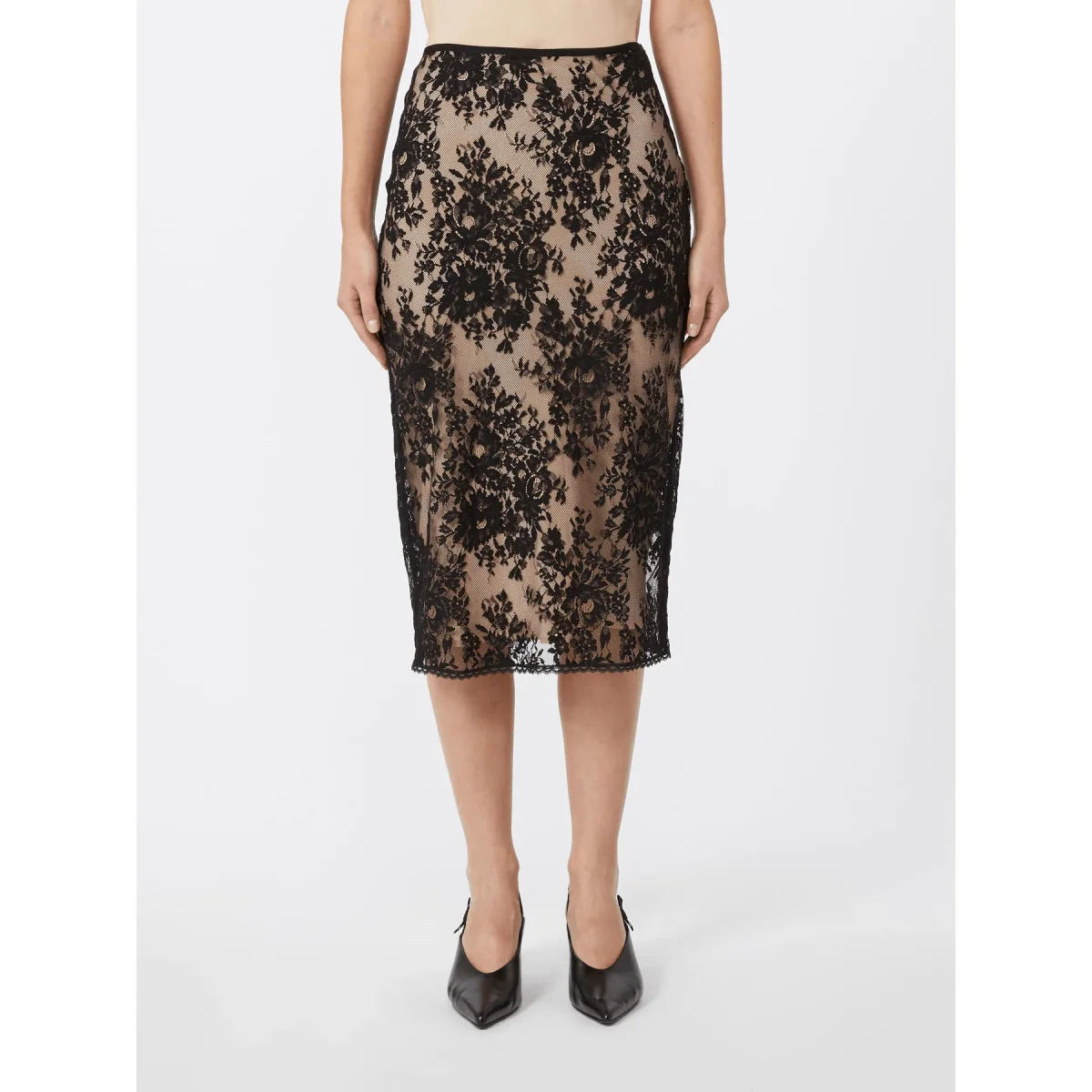 Modello: COSMO Gonna midi dalla caratteristica silhouette a tubino. Gonna in pizzo floreale su base in tulle Linea dritta Chiusura con zip invisibile sul fianco sinistro Vita rifinita con bordo in gros grain Bordo smerlato sul fondo