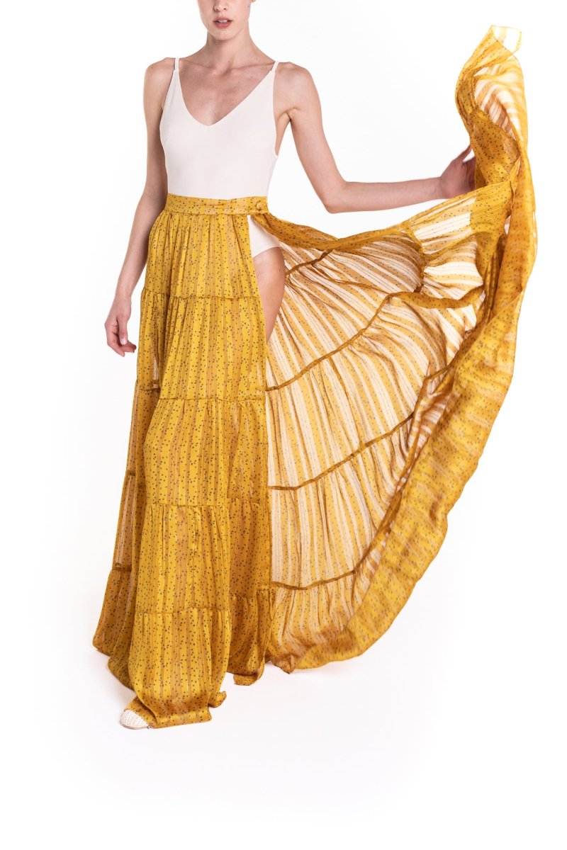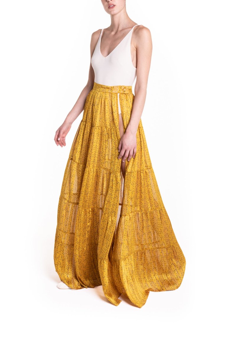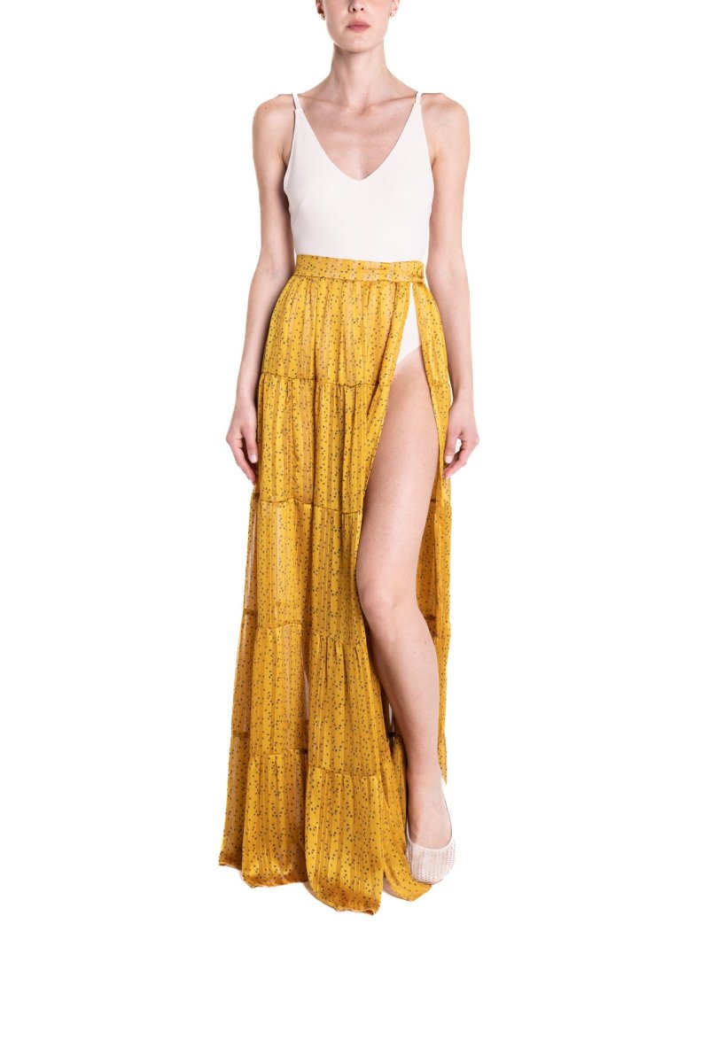 Maxi portafoglio con balze, sensuali trasparenze, con profondo spacco, perfetta al mare come copricostume o per un aperitivo glamour. Da indossare con il costume o un body, cappello in paglia e sandali.