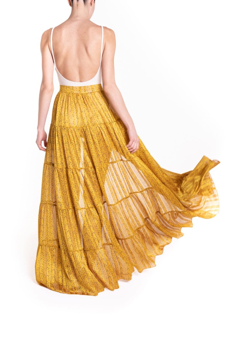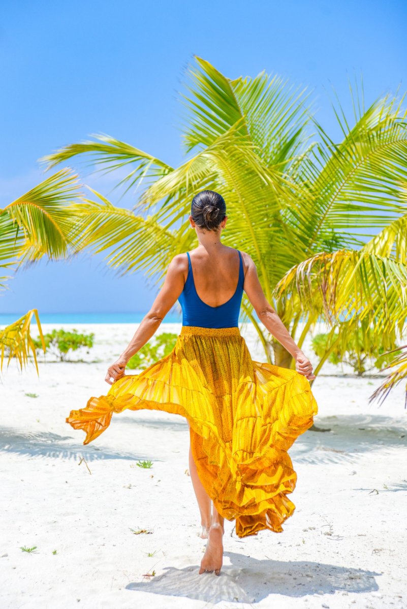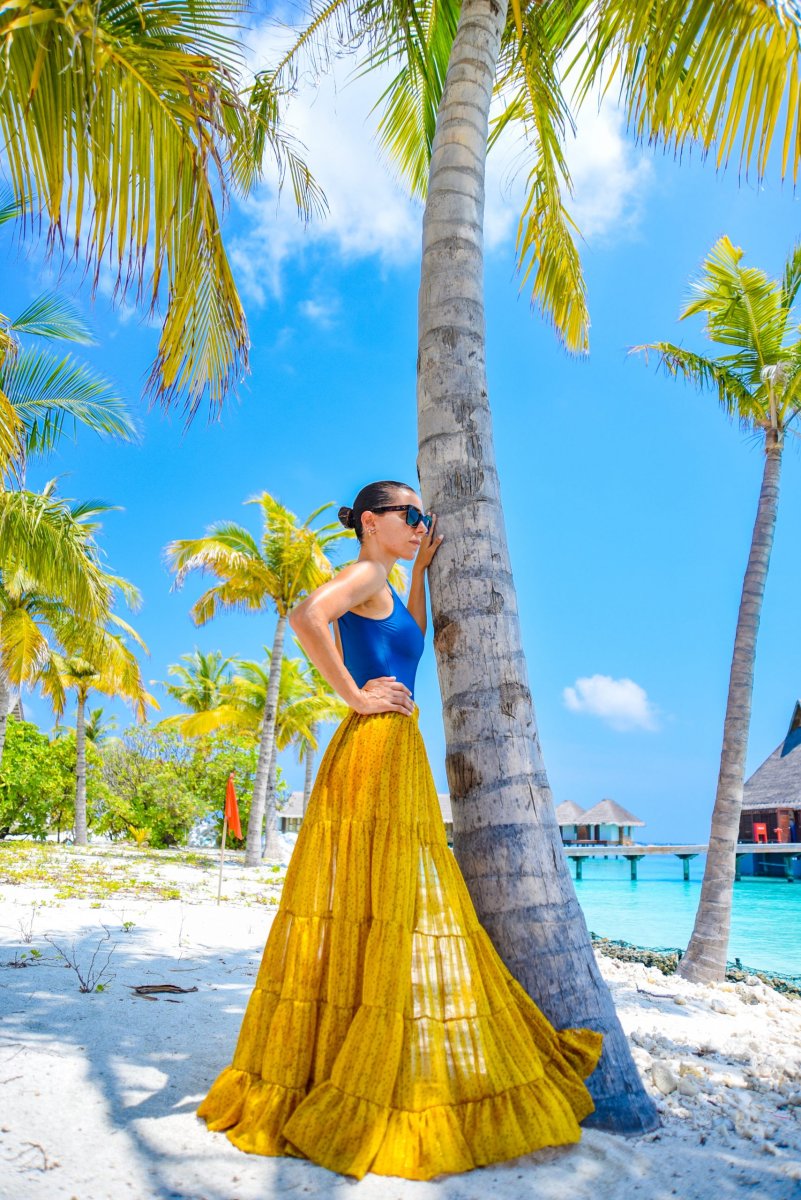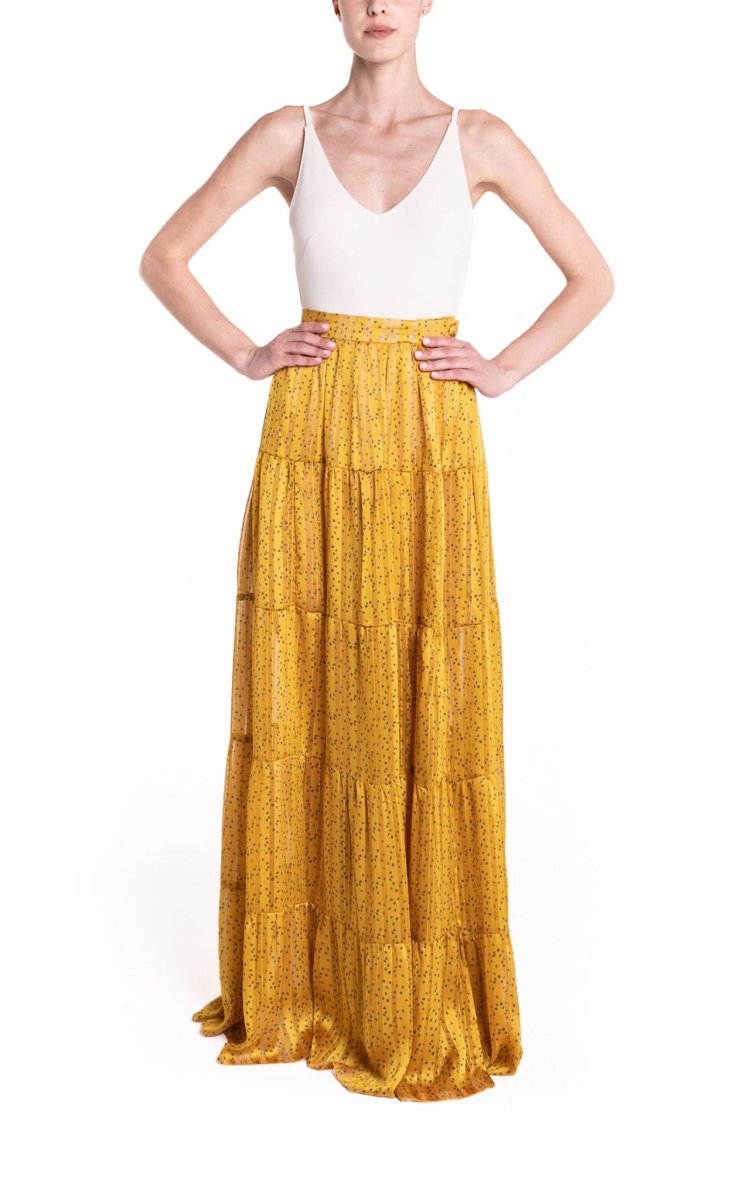 Maxi portafoglio con balze, sensuali trasparenze, con profondo spacco, perfetta al mare come copricostume o per un aperitivo glamour. Da indossare con il costume o un body, cappello in paglia e sandali.