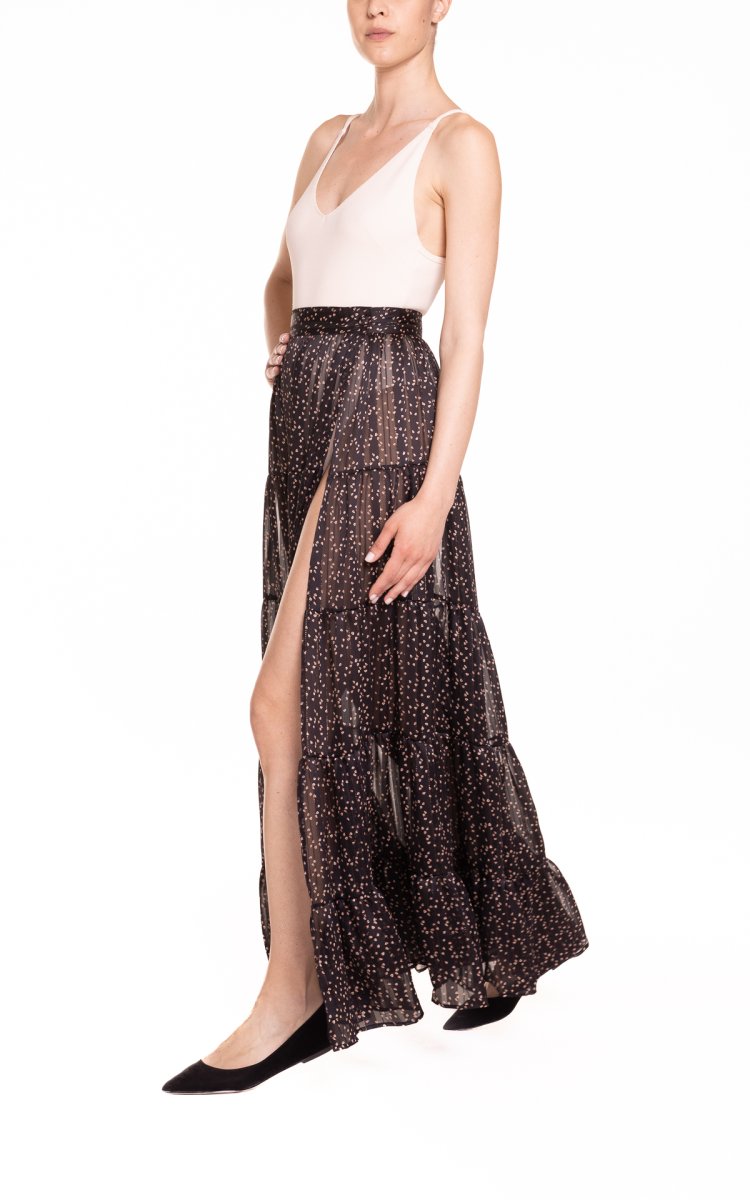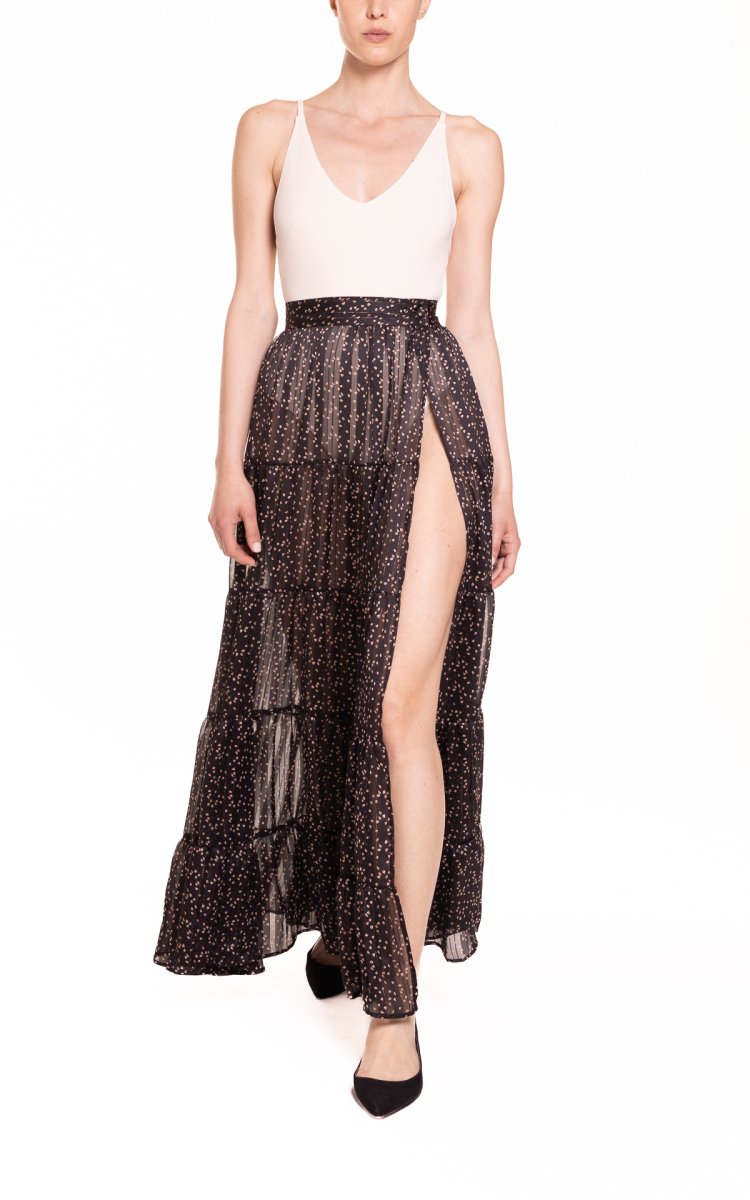 Maxi portafoglio con balze, sensuali trasparenze, con profondo spacco, perfetta al mare come copricostume o per un aperitivo glamour. Da indossare con il costume o un body, cappello in paglia e sandali.