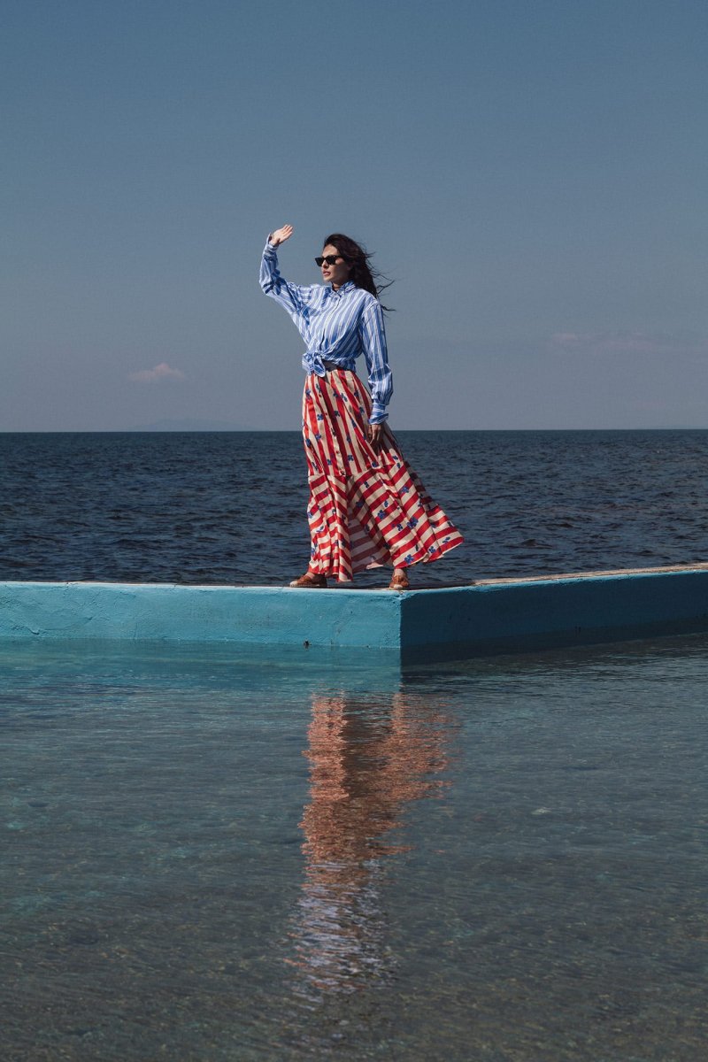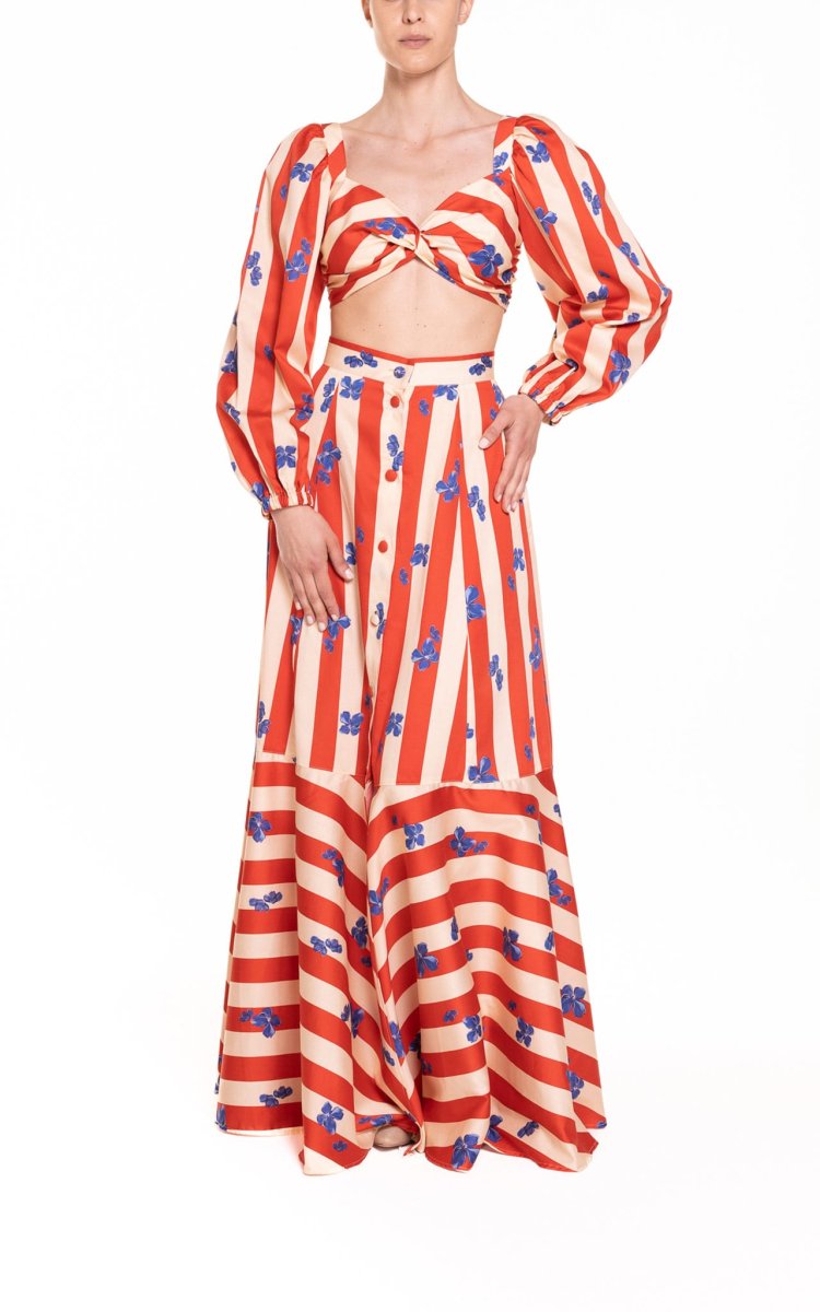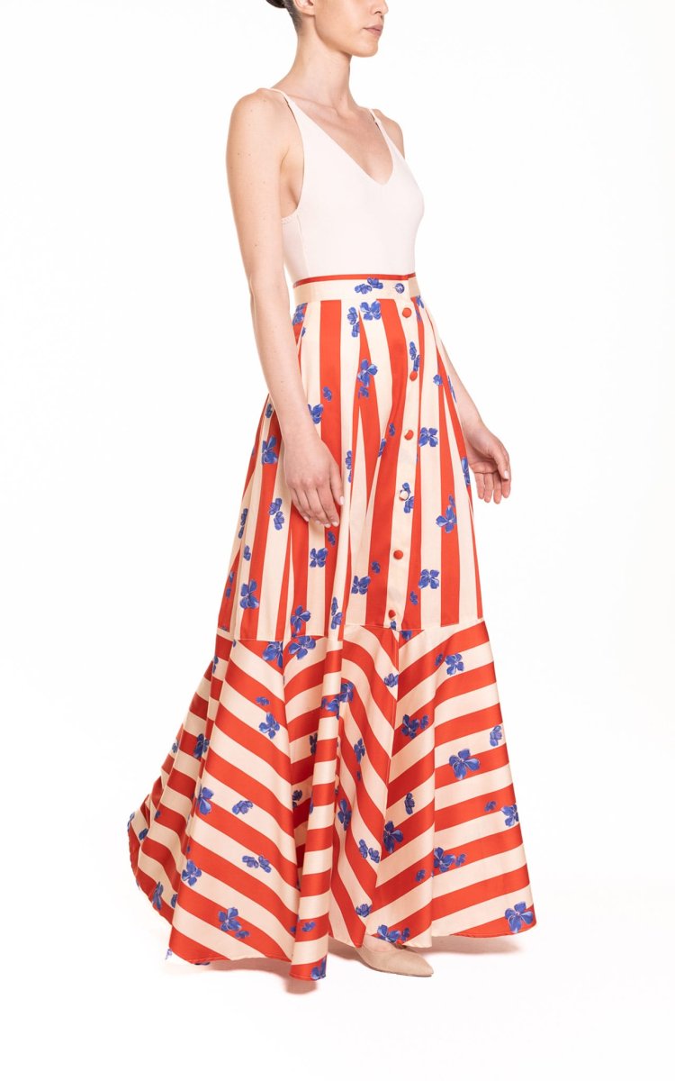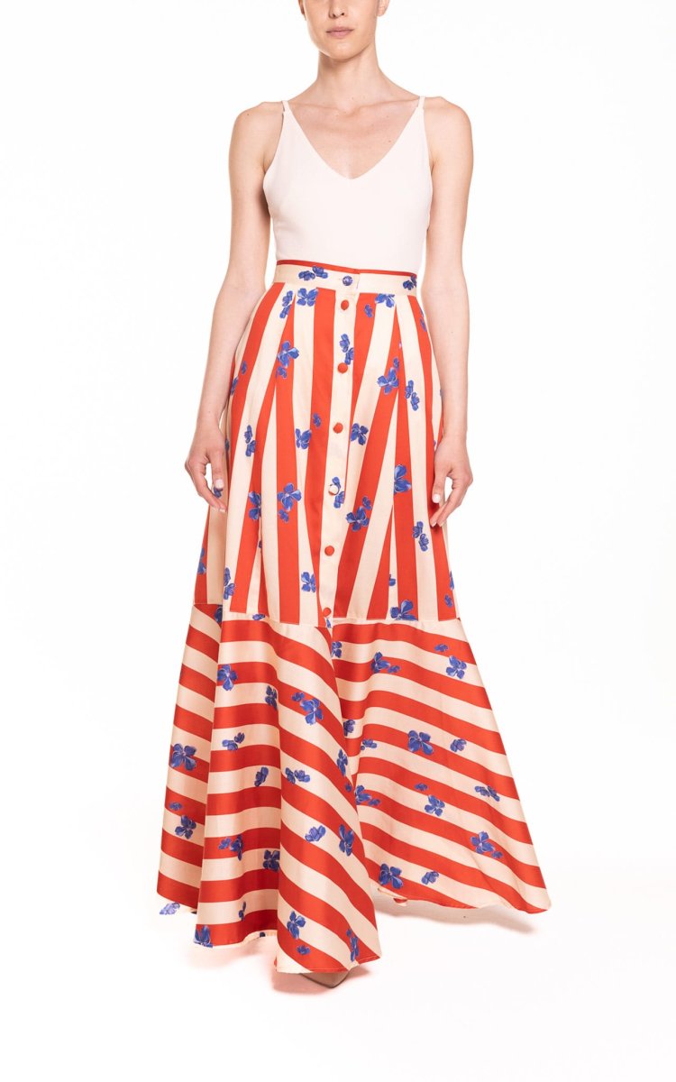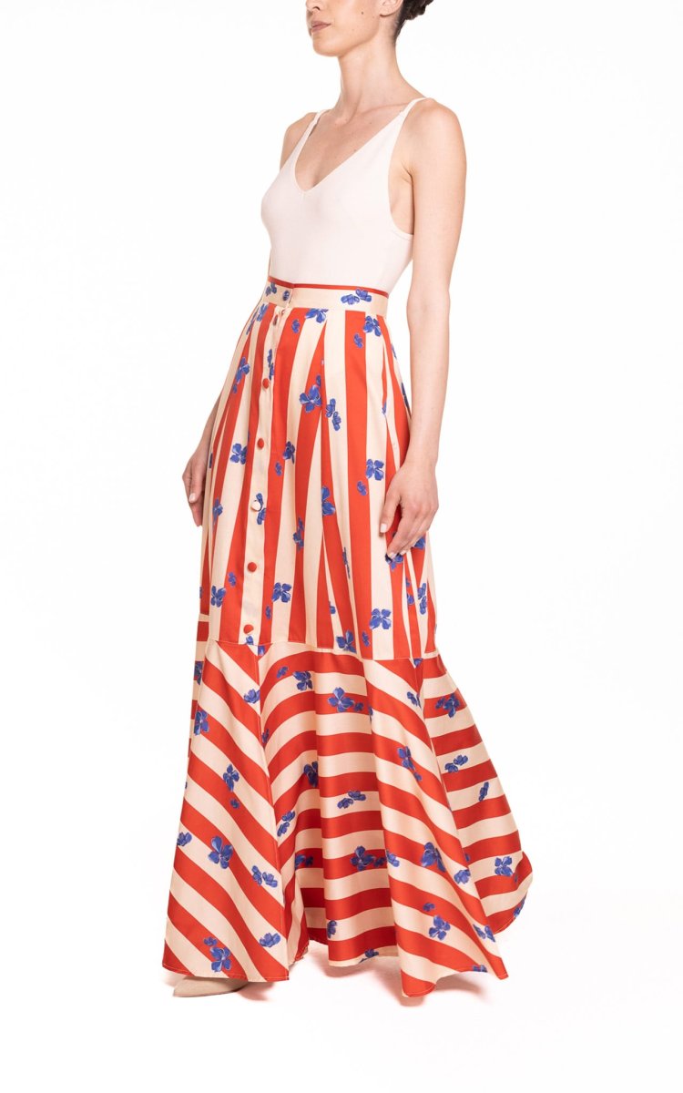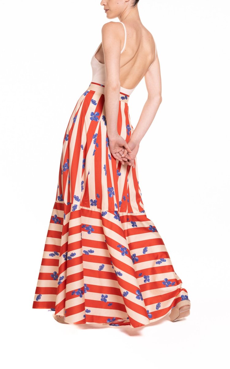 Maxi gonna sartoriale con silhouette a trapezio, dal carattere brioso, animata dalla stampa a righe con fiori dipinti a mano, a contrasto, che donano movimento al capo. Il suo estro conferma ancora una volta la sua versatilitร : country chic, glamour ed estremamente di classe, tutto in una sola iconica, poliedrica, gonna adatta ad ogni donna in ogni occasione.