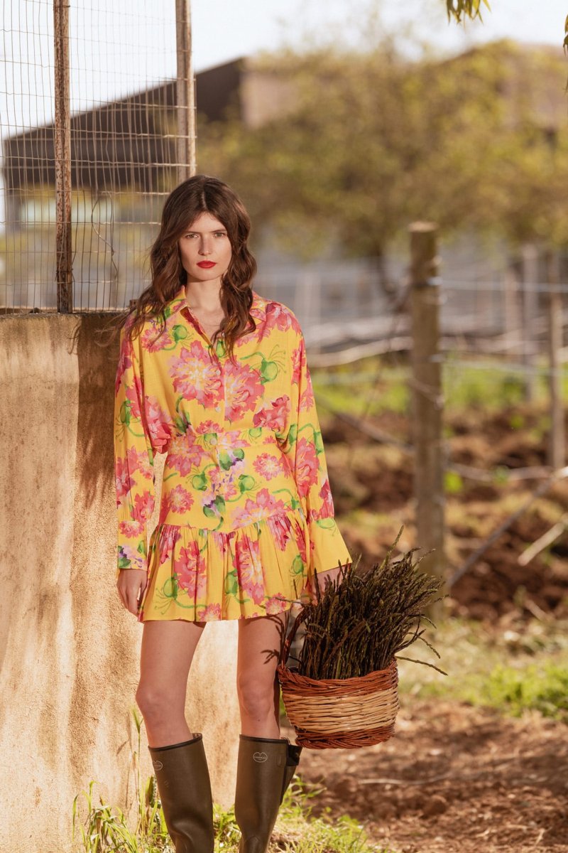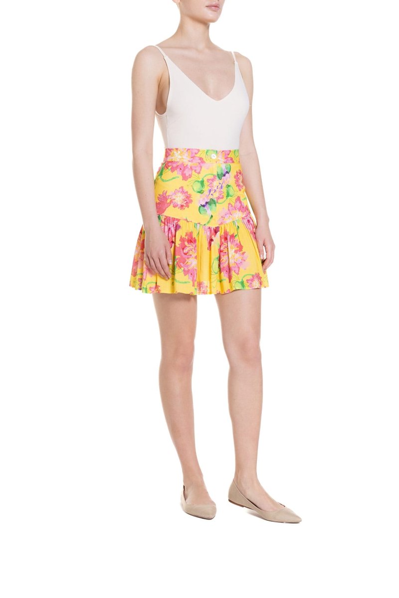 Fresca, giocosa e irresistibilmente femminile: questa minigonna รจ un must-have per la bella stagione. Caratterizzata da una linea a vita alta, con baschina, presenta una delicata balza arricciata sul fondo che aggiunge volume e movimento al look. Perfetta da abbinare con crop top o camicia della stessa fantasia per uno stile casual chic e versatile, da mattina a sera.