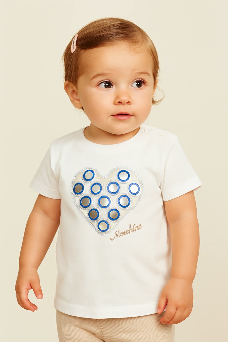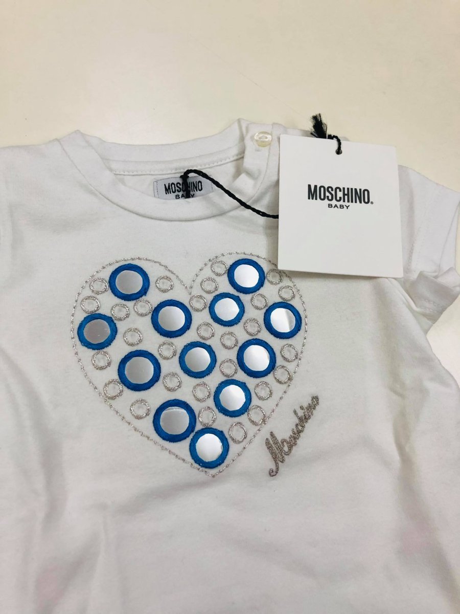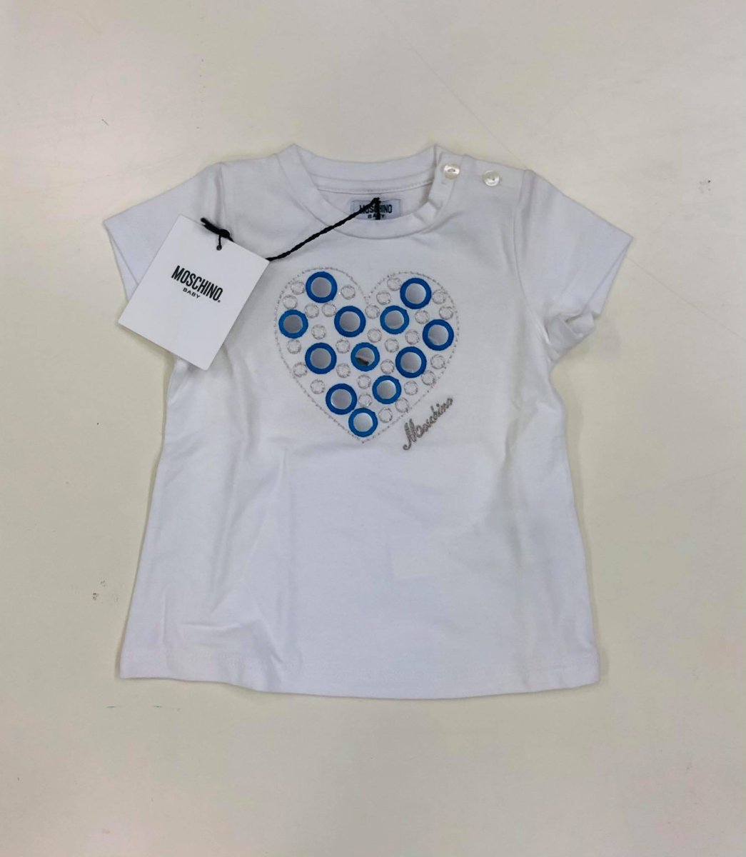MOSCHINO T-SHIRT Moschino t-shirt manica corta e giroccolo, applicazioni sulla tshirt logo in ricamo, bottoncini lato collo colore: bianco con rifiniture in azzurro composizione: cotone taglia: dalla 6 mesi alla 12 mesi
