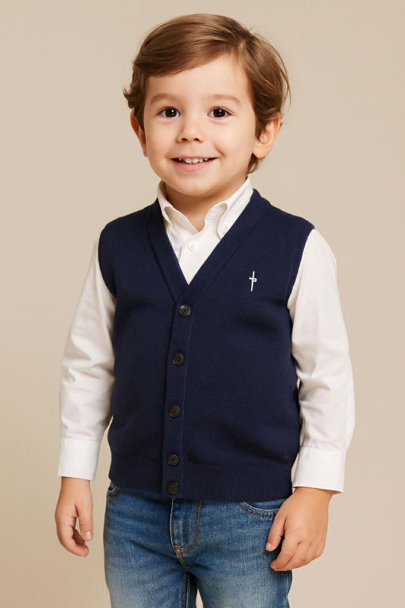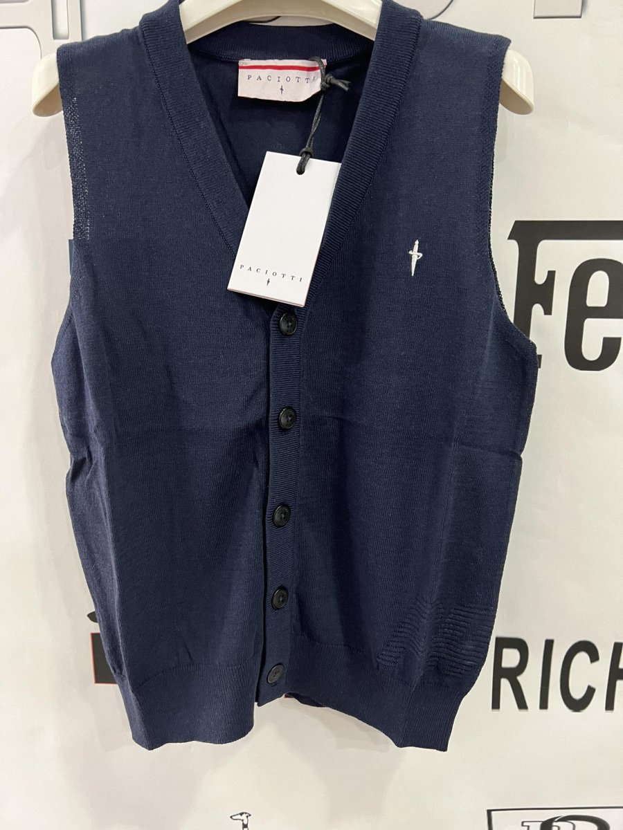 PACIOTTI GILET MAGLIA PACIOTTI GILET MAGLIA chiusura con bottoni logo al petto e sul fondo colore: blu taglia: dalla 36 mesi alla 6 anni composizione: 60% cotone 40% rayon