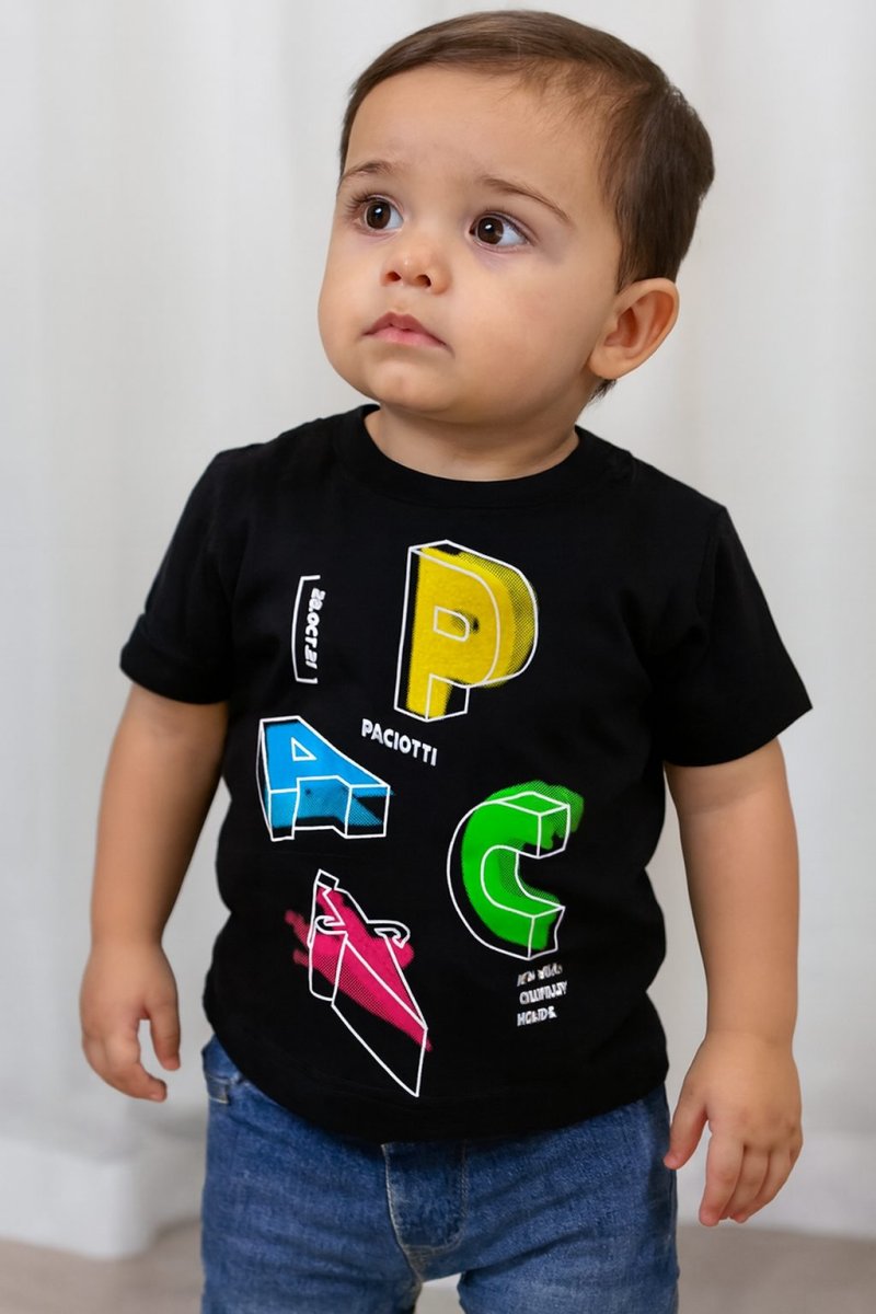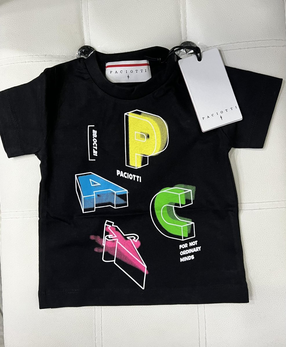 PACIOTTI T-SHIRT PACIOTTI T-SHIRTย manica corta. chiusura con bottoni lato collo (fino alla taglia 24 mesi). grande logo centrale colore: nero composizione: 100% cotone taglia: dalla 6 mesi alla 4 anni