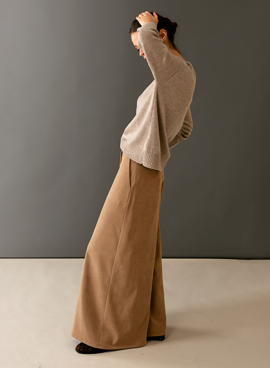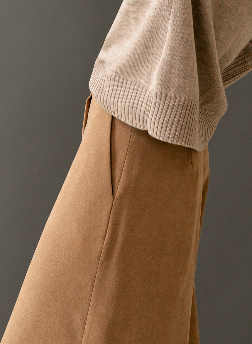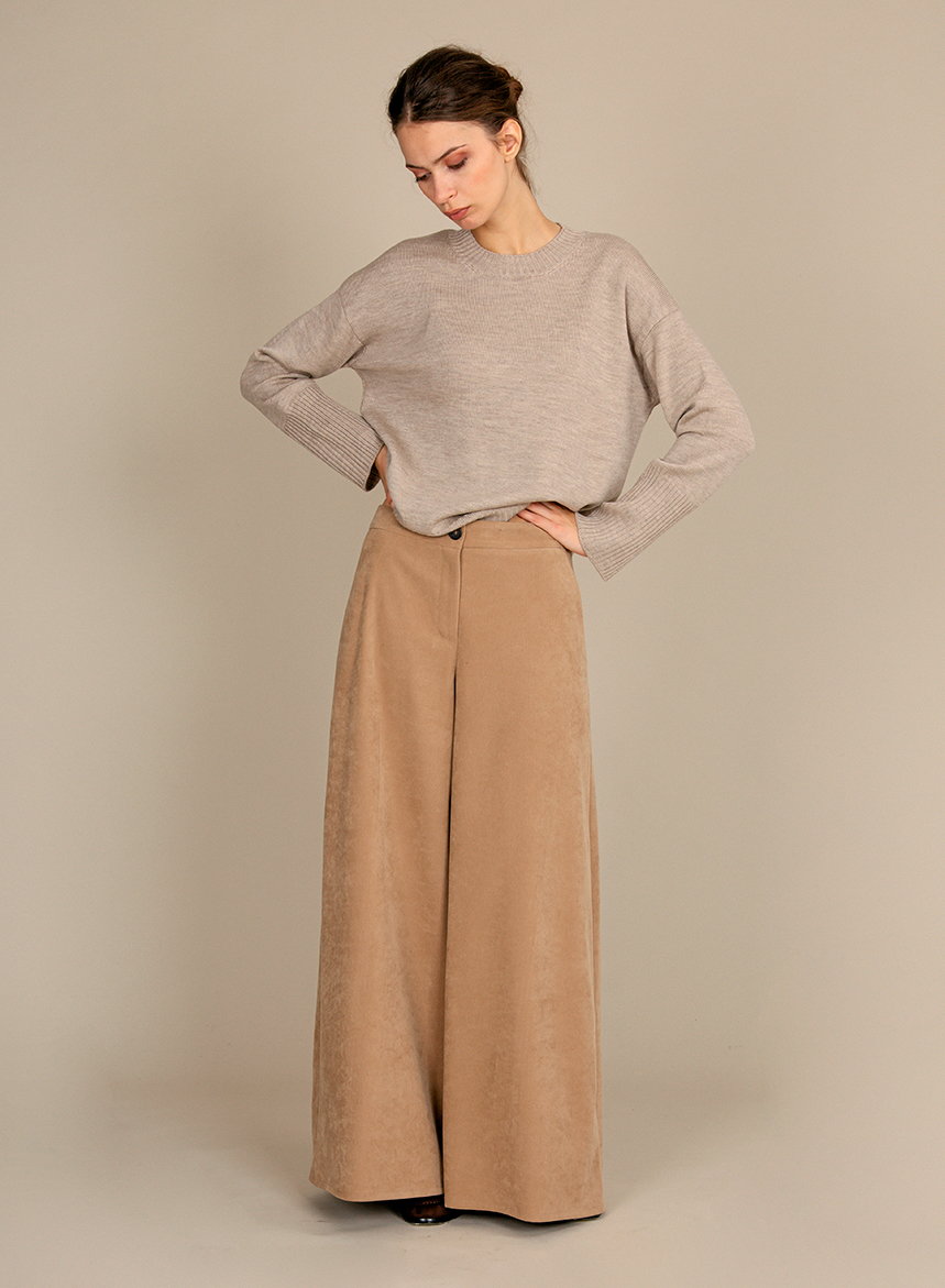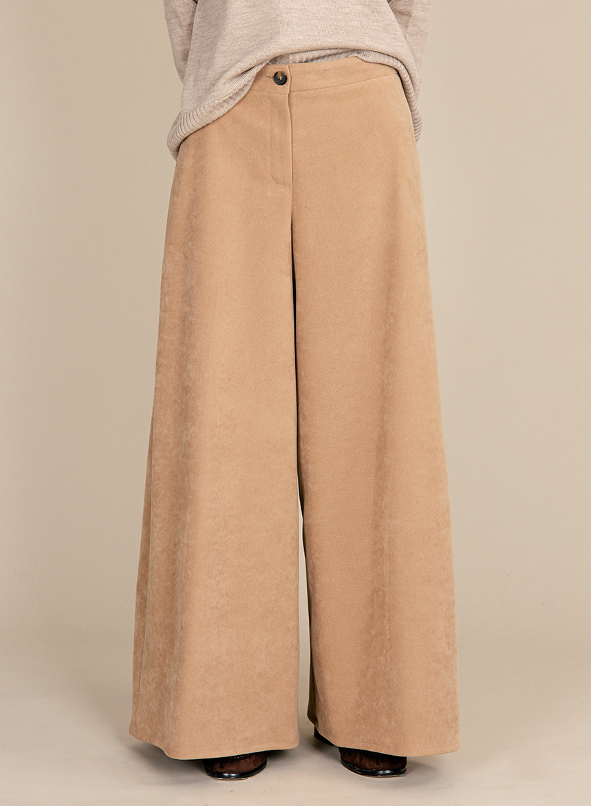 Pantagonna in morbido e fluido tessuto di velluto stretch. Linea ampia, con allacciatura anteriore con zip ed un bottone. Tasche anteriori alla francese. La modella รจ alta 175 cm e indossa una taglia 40.