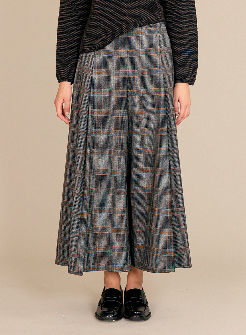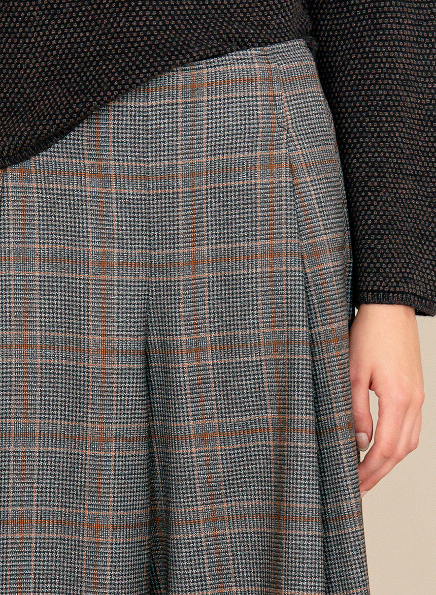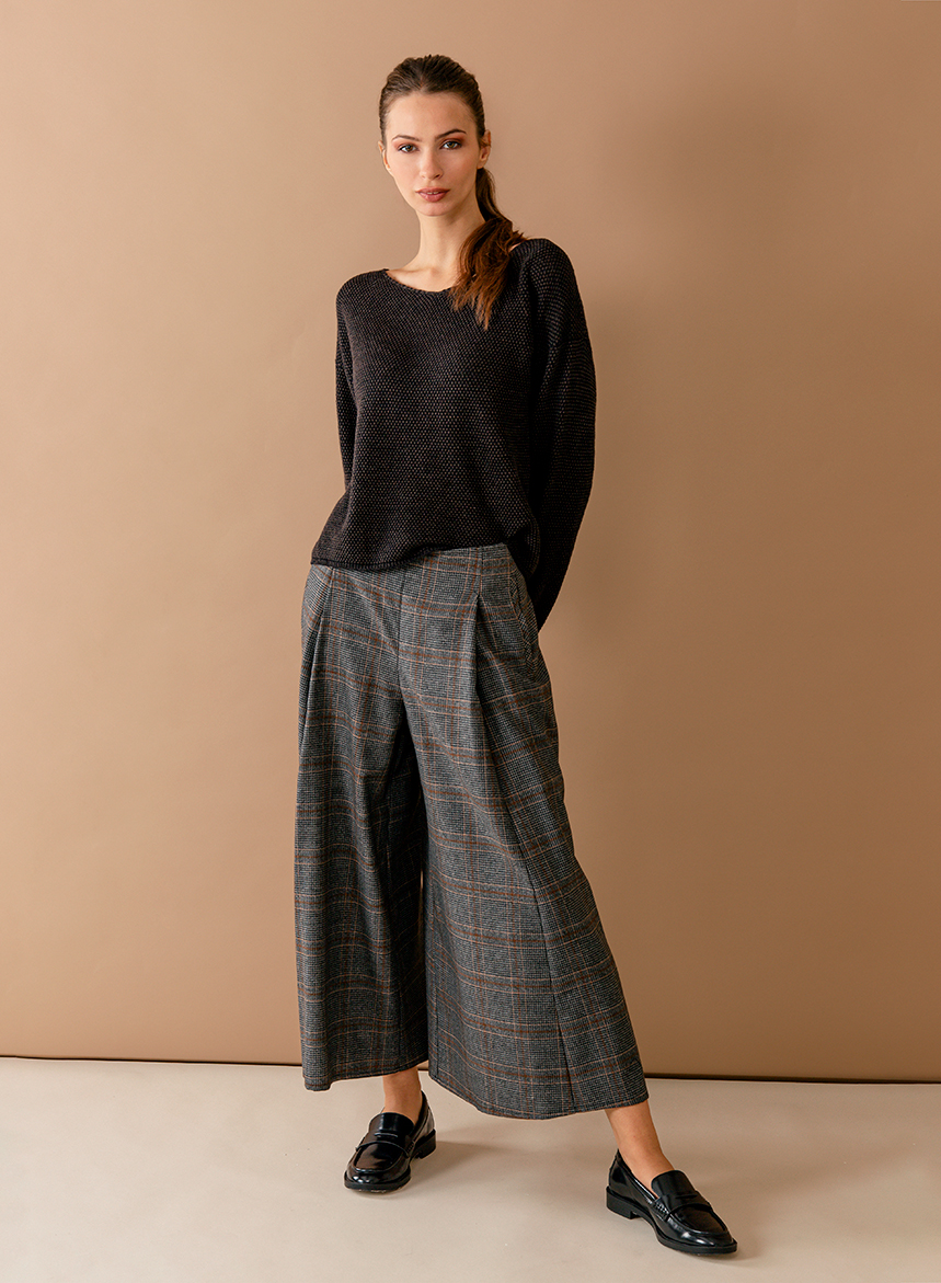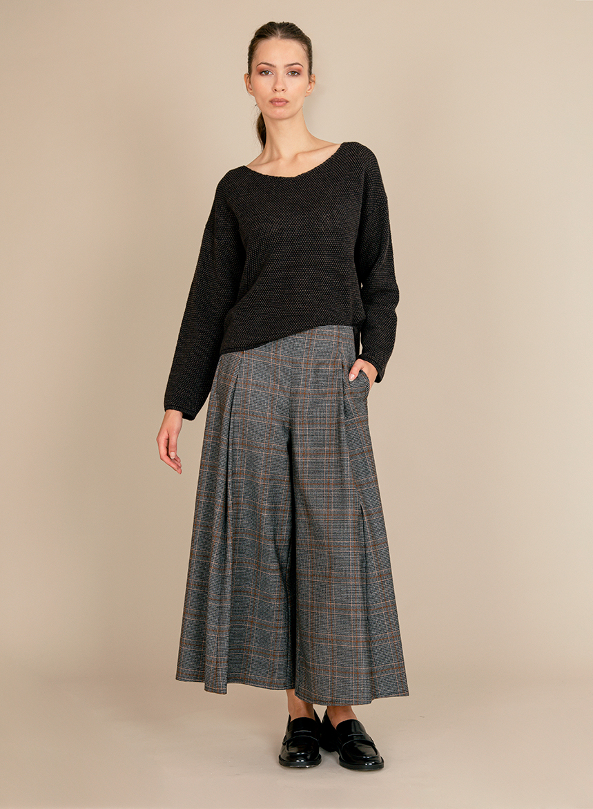 Pantagonna ampia in Lana Vergine con tasche a filetto sui fianchi e chiusura posteriore a zip. La modella รจ alta 175 cm e indossa una taglia 40.