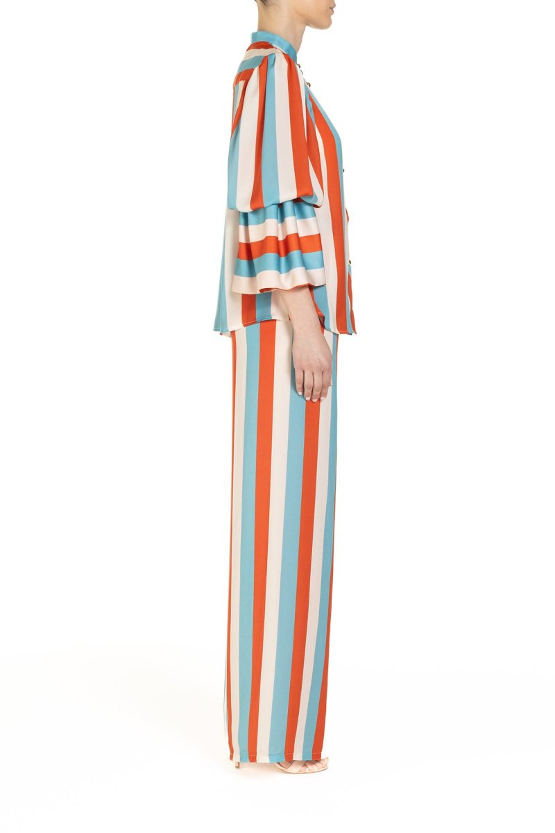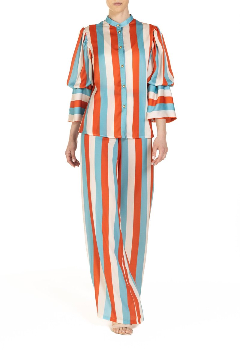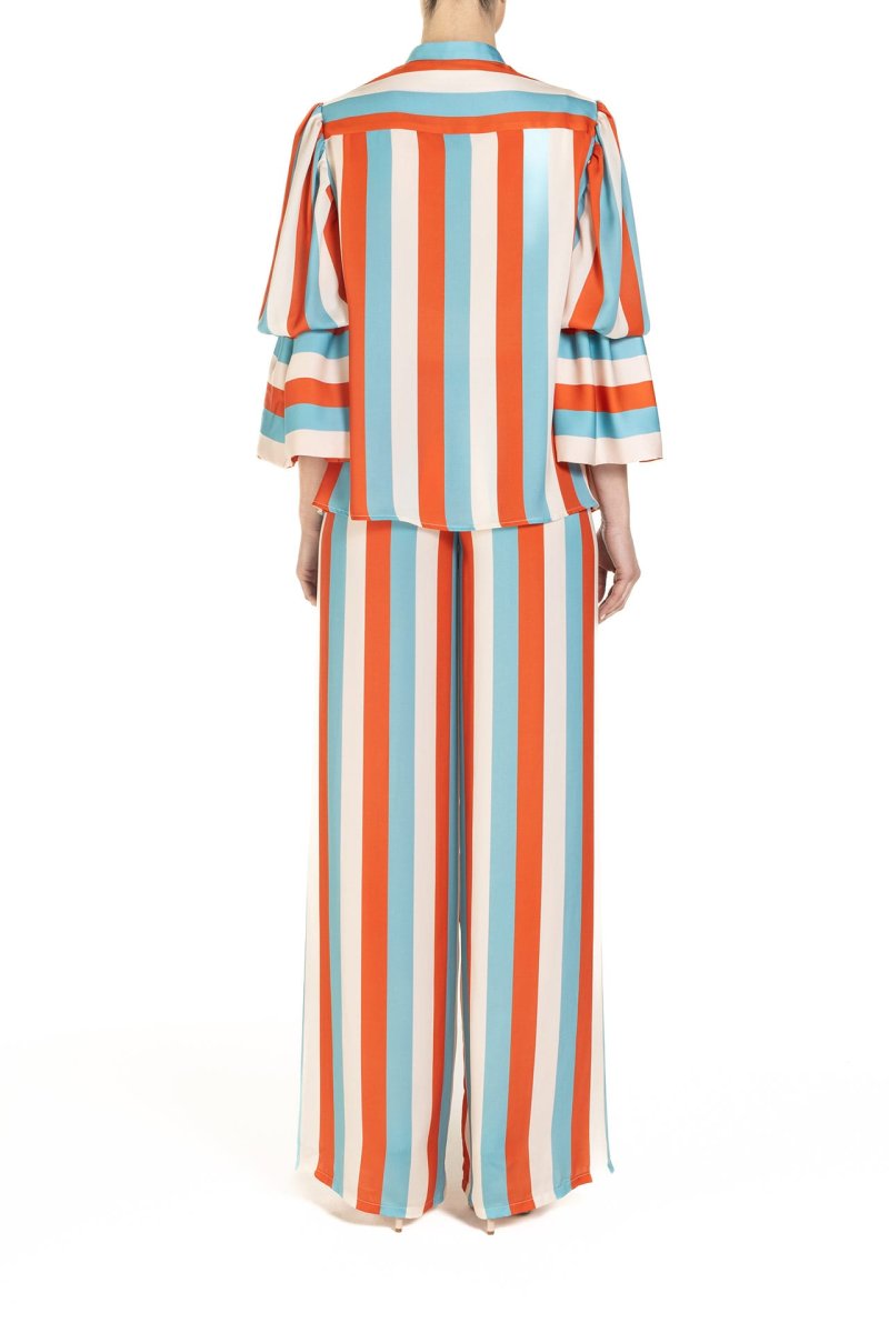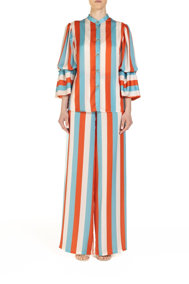 Pantaloni a palazzo, comodi e incredibilmente chic, con le iconiche righe Poupine ed un comodo elastico in vita. Perfetti per costruire un raffinato stile cruise, possono accompagnare i primi bagni di sole o facilmente diventare protagonisti di una cena al chiaro di luna.