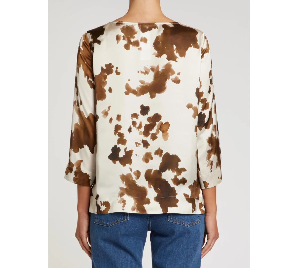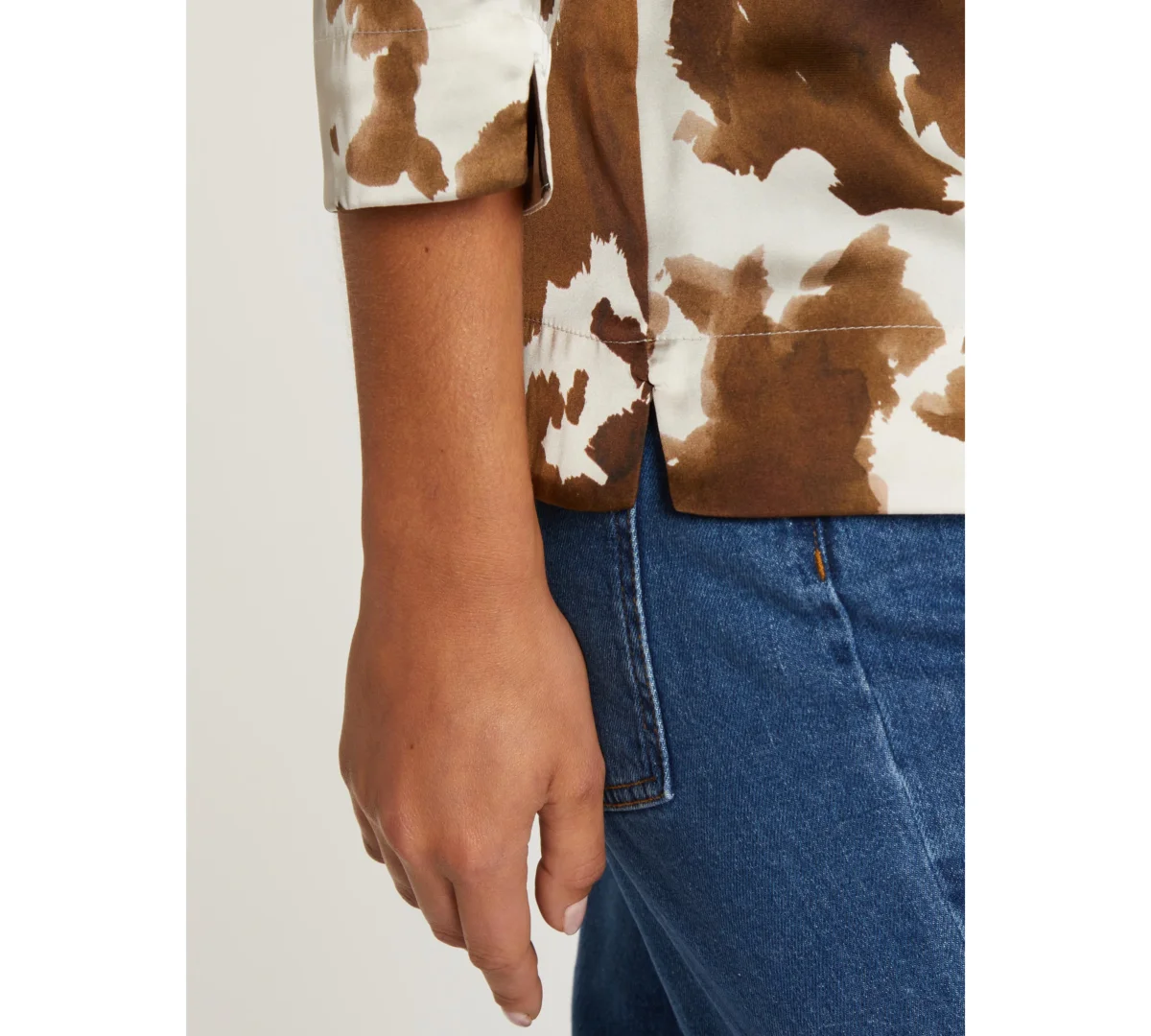 Una frizzante pioggia di pois si posa su questa blusa dal design pulito in raso fluido: con i jeans o i pantaloni classici, sempre chic.