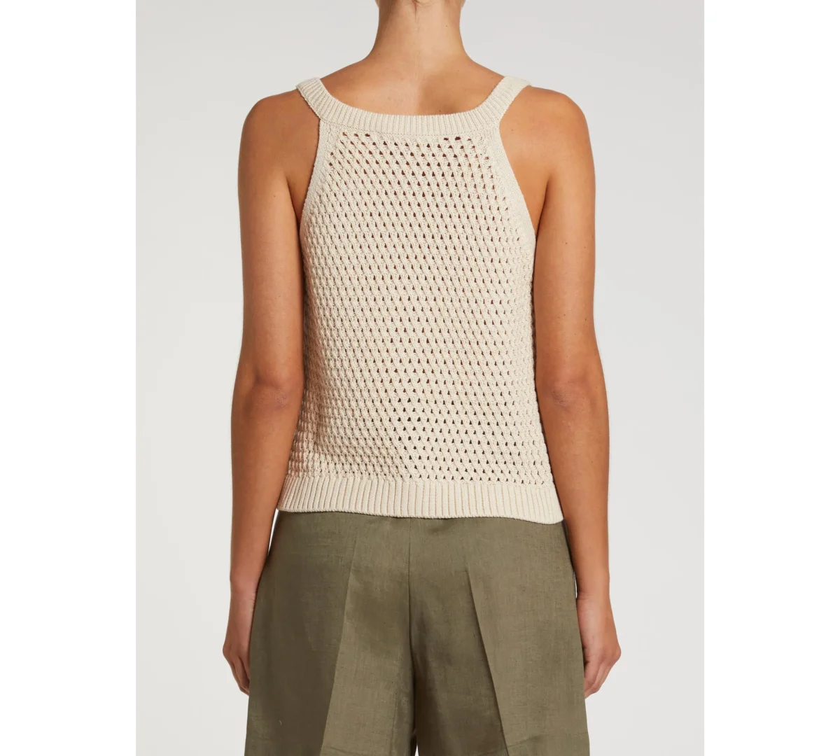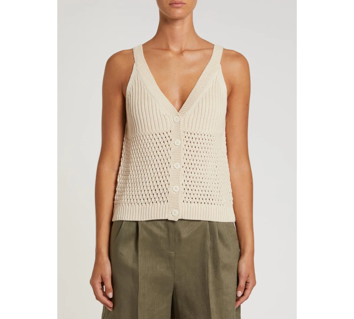 Modello: DIALOGO Lavorazione dal gusto handmade e proporzioni che sfiorano il corpo per questo gilet in cotone. Indossato sulla camicia, come sottogiacca o come top, sempre perfetto. Filato in puro cotone Lavorazione traforata a rete Dettagli e bordi a coste Scollo a V profondo Chiusura con bottoni sul davanti Fit aderente