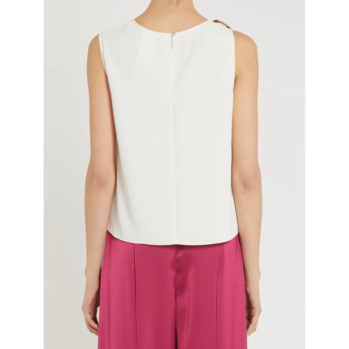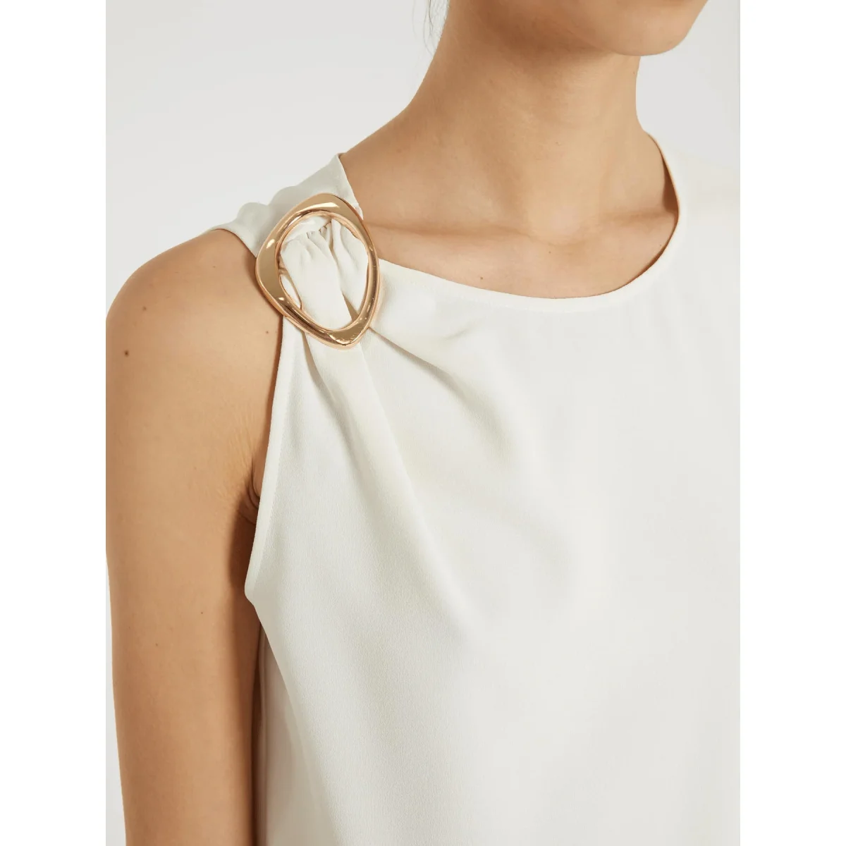La vera eleganza รจ spesso questione di dettagli: come per questo top, arricchito da una fibbia in metallo che crea un drappeggio asimmetrico sulle sue linee pure.