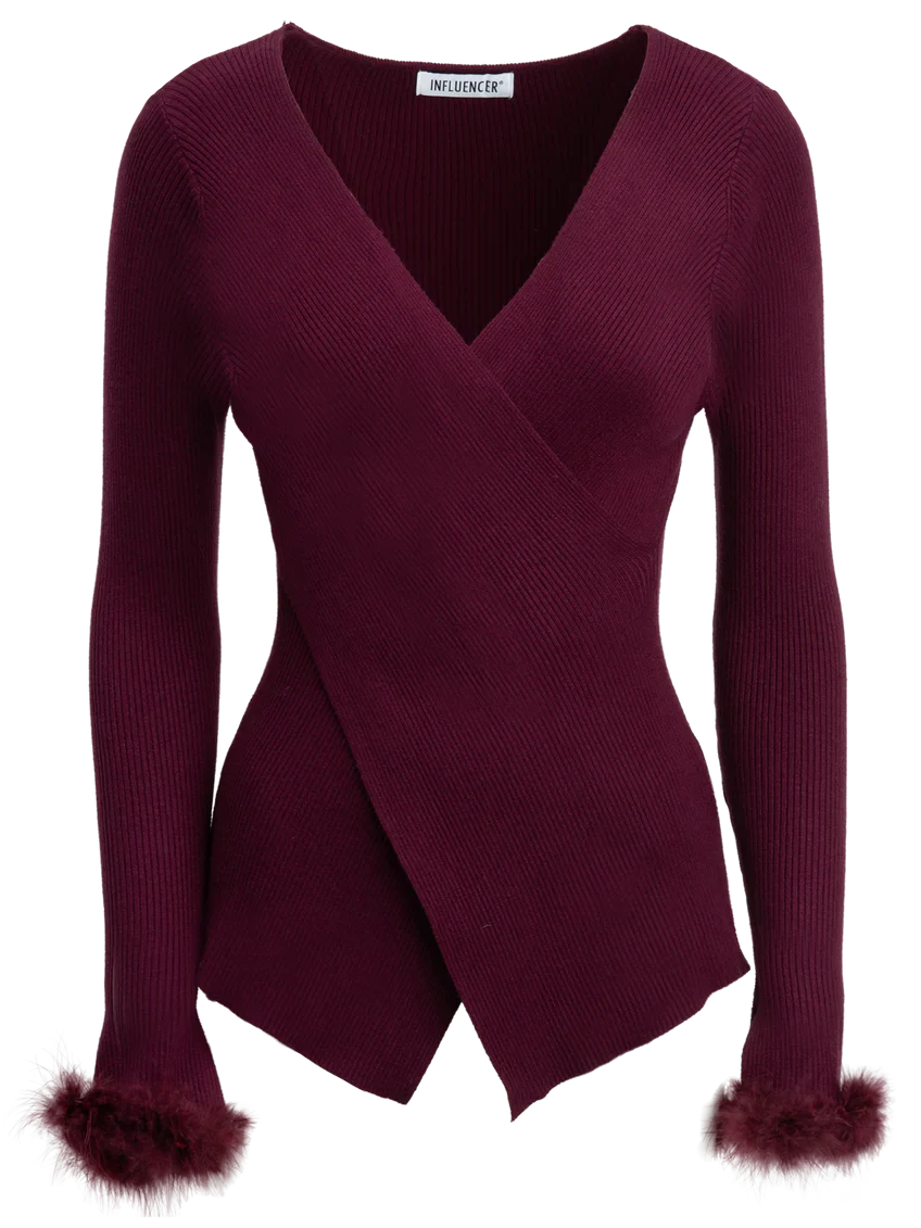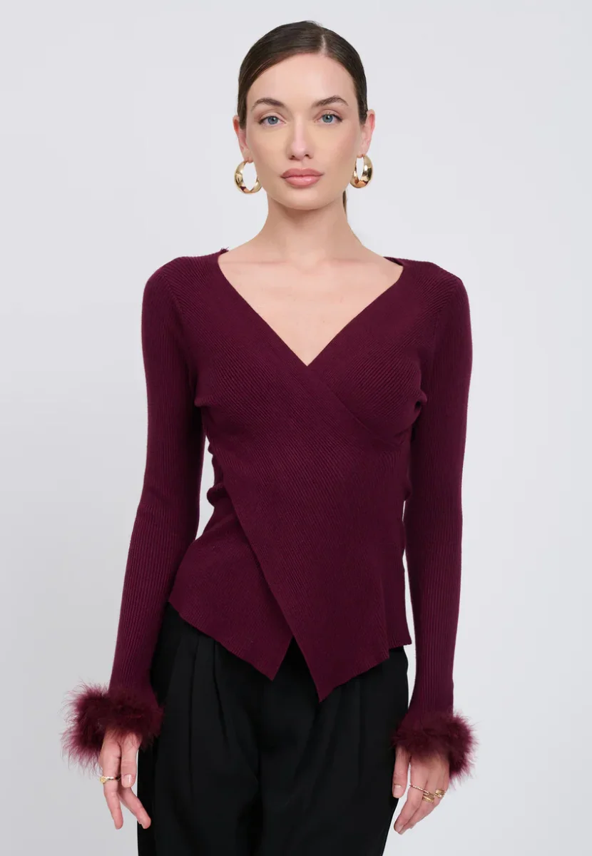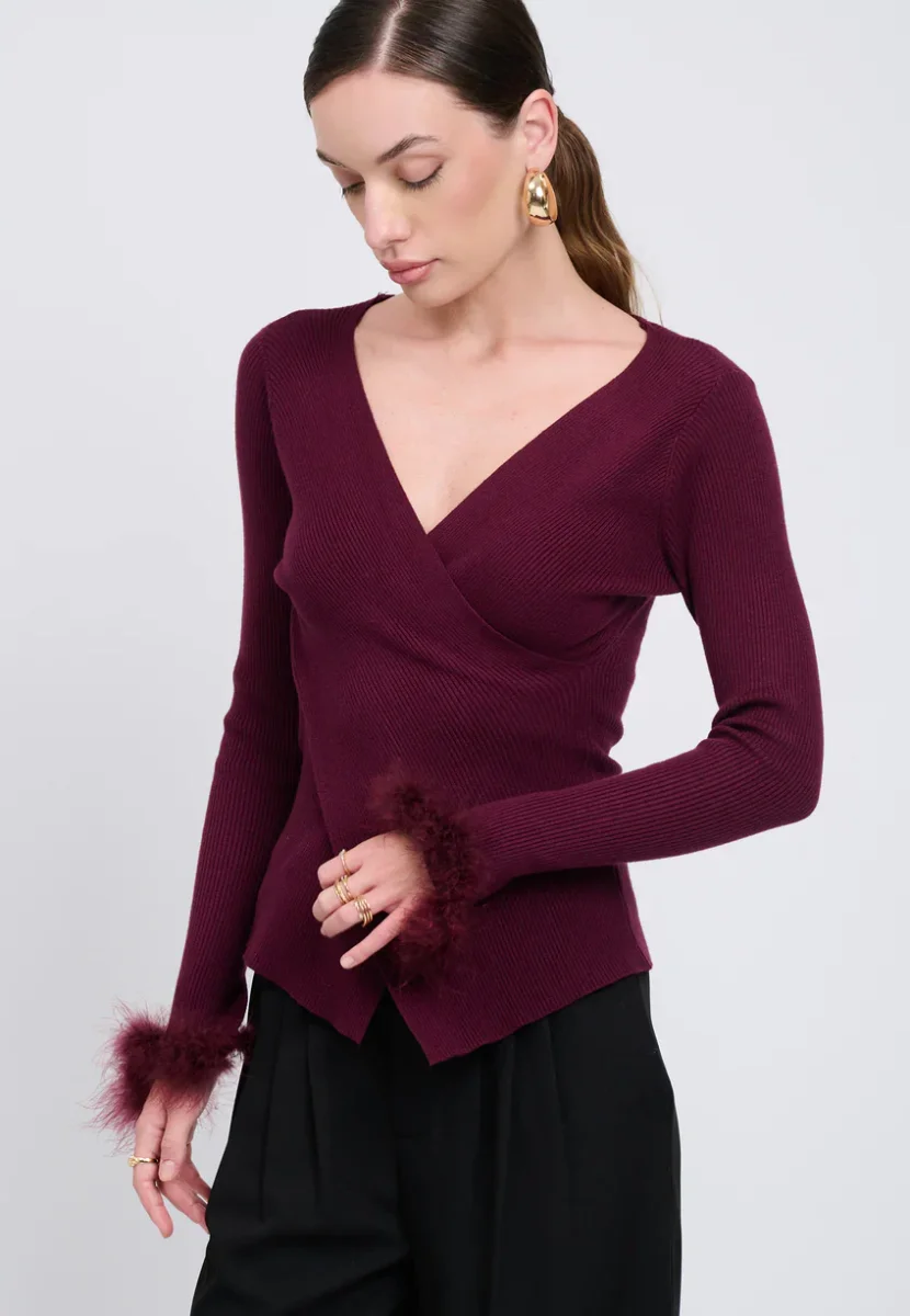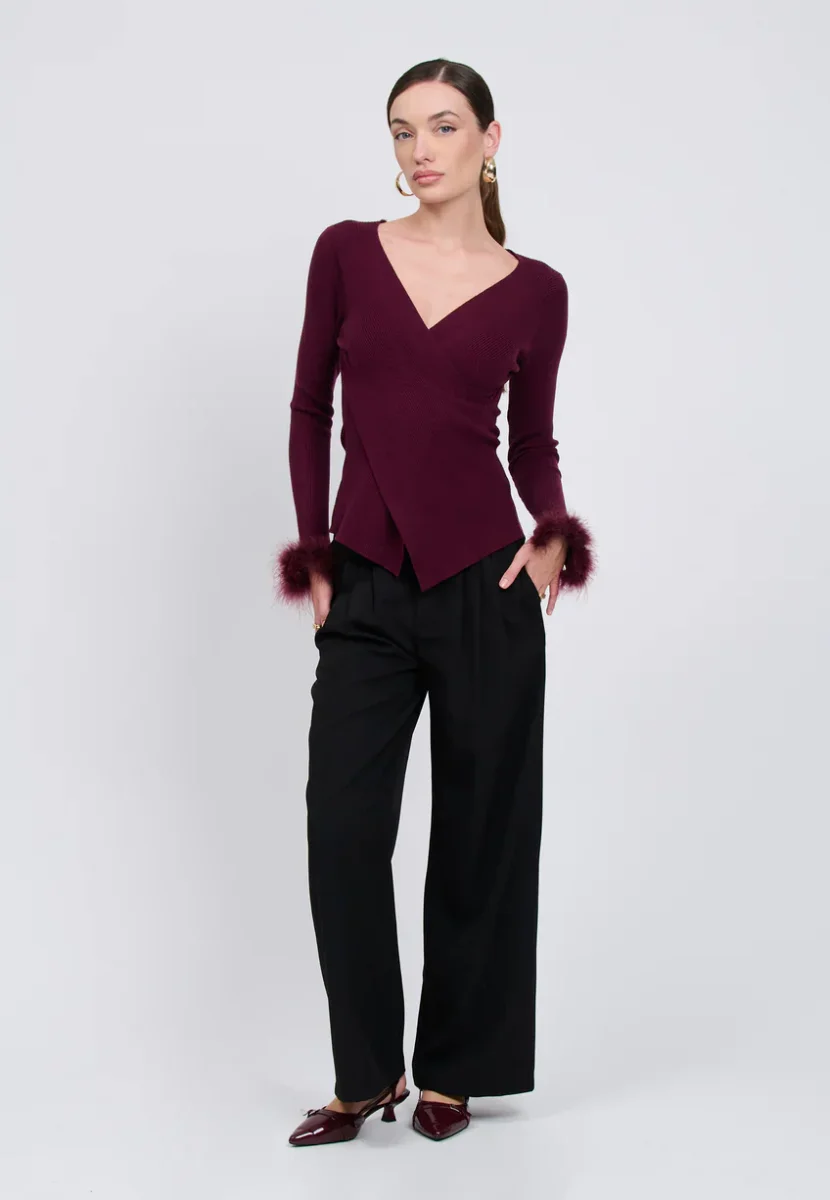 La silhouette si definisce, giocando l’equilibrio tra sensualitร e struttura. Questa maglia ad incrocio rivela uno scollo profondo a V e delle maniche lunghe messe in risalto da polsini in finta piuma in tinta. Un capo audace da abbinare a un pantalone sartoriale per un look chic ed estremamente femminile.