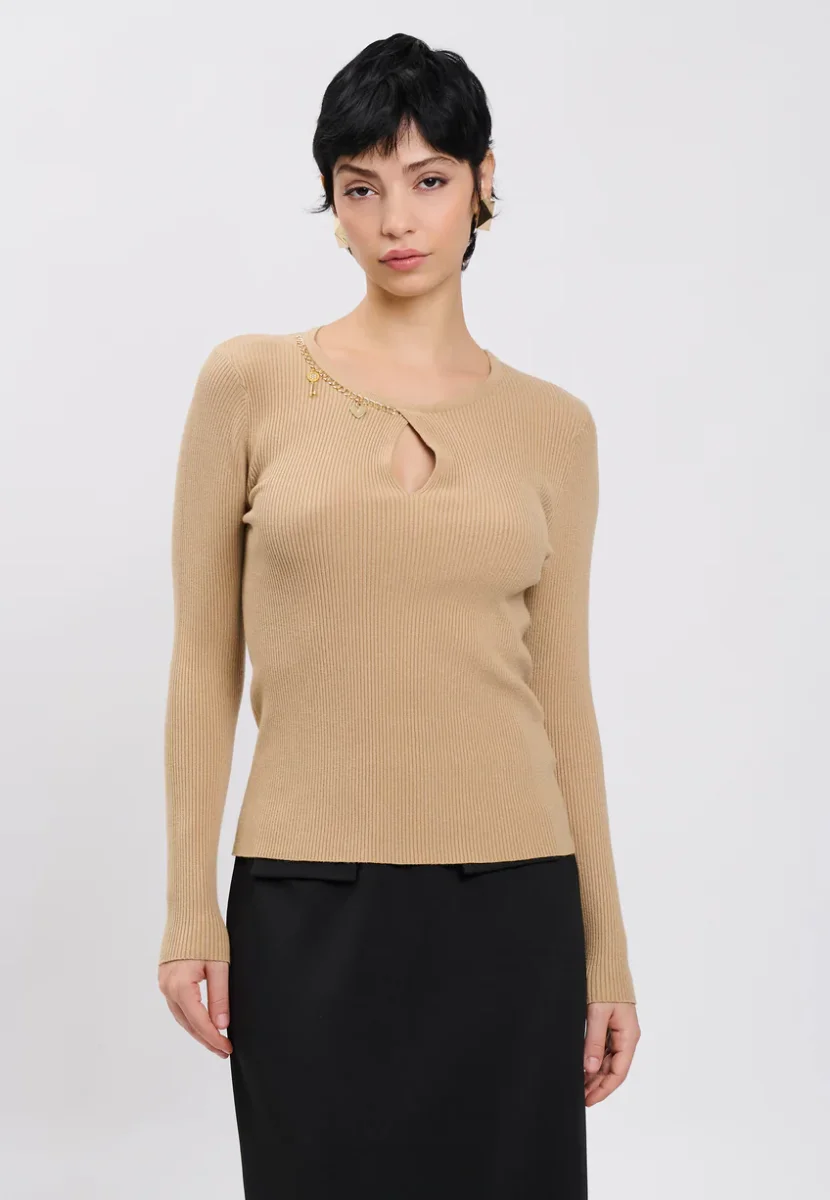 Questa maglia a coste, caratterizzato da girocollo e cut-out a goccia, offre un taglio aderente per un effetto seconda pelle. ร chic e casual, e sulla scollatura presenta un’applicazione a catena con pendenti di varie forme: un inconfondibile dettaglio che risalta il tuo look della stagione.