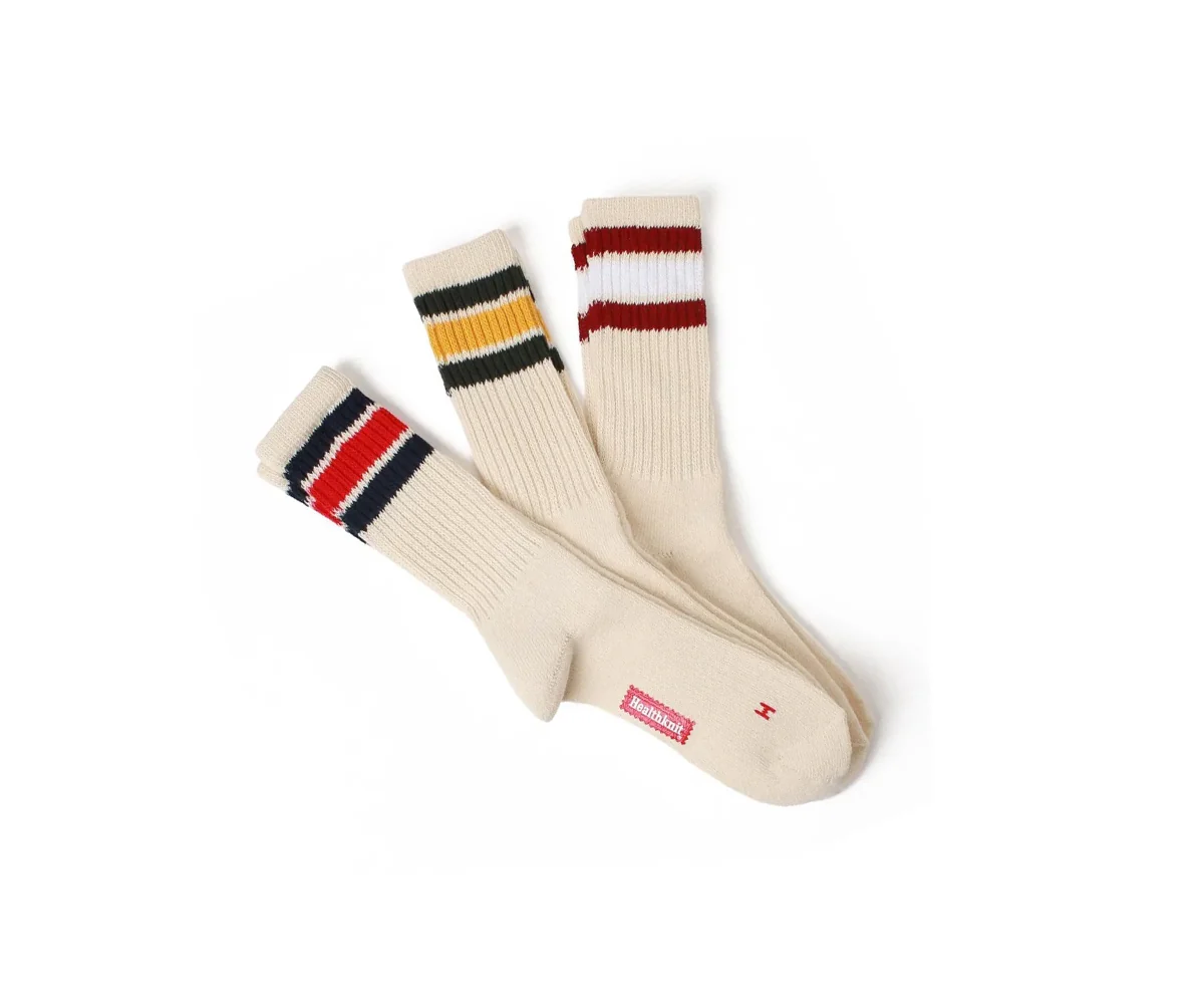 Questi comodi calzini presentano una combinazione di tre righe colorate. Questo set include tre paia di calzini, ognuno con corpo bianco e righe di colori diversi. Il design a righe sul colletto aggiunge un tocco di stile a qualsiasi outfit. Presentano anche una stampa con il logo Healthknit.