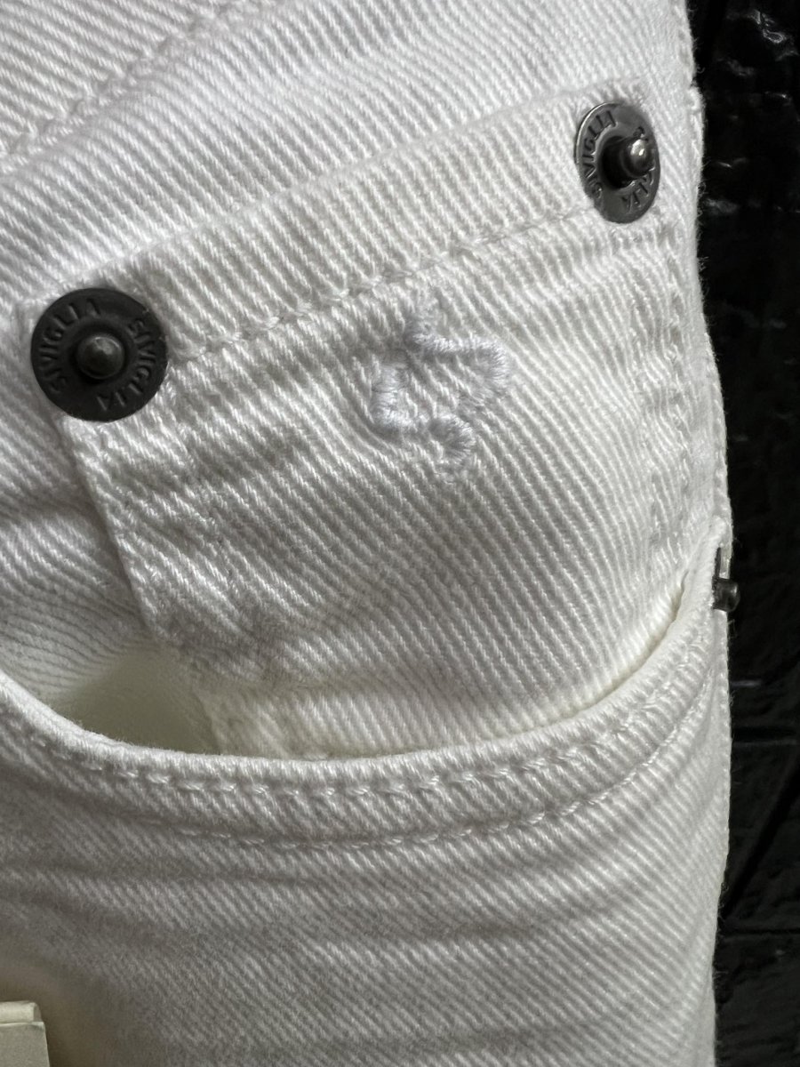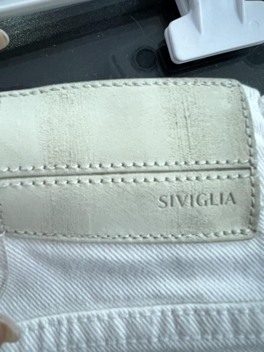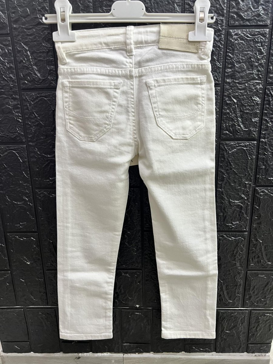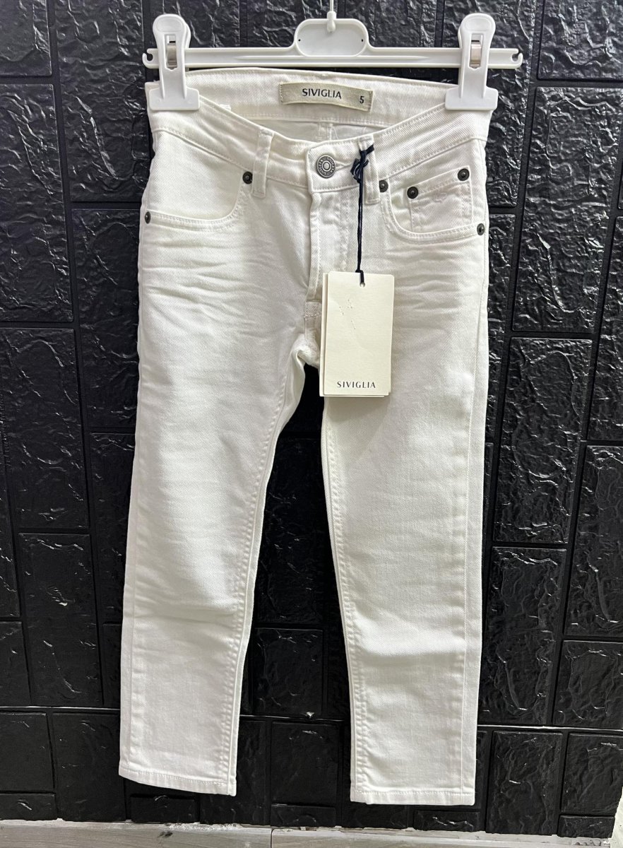 SIVIGLIA PANTALONE BAMBINO SIVIGLIA PANTALONE BAMBINO lungo chiusura con zip e bottone, modello slim. cinque tasche. logo nel taschino, linguetta sul retro leggermenteย rovinata. da ciรฒ dipende il prezzo piรน basso del capo colore:ย BIANCO taglia: 5ย anni composizione: 98% cotone 2% elastico DENIM