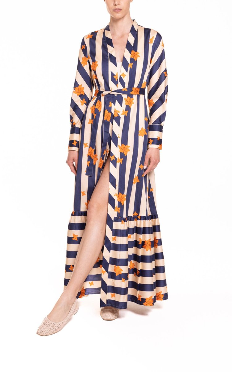 Soprabito lungo con manica lunga e ruches riga blu e panna con fiore arancio