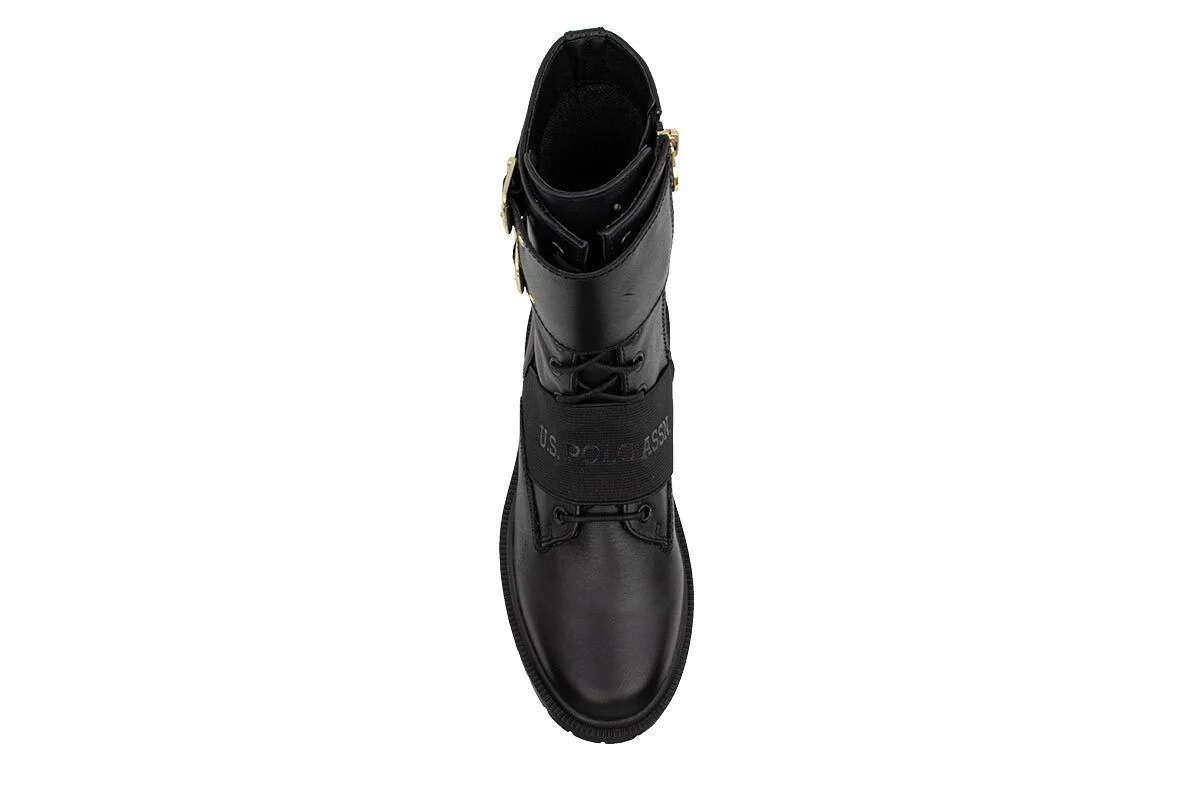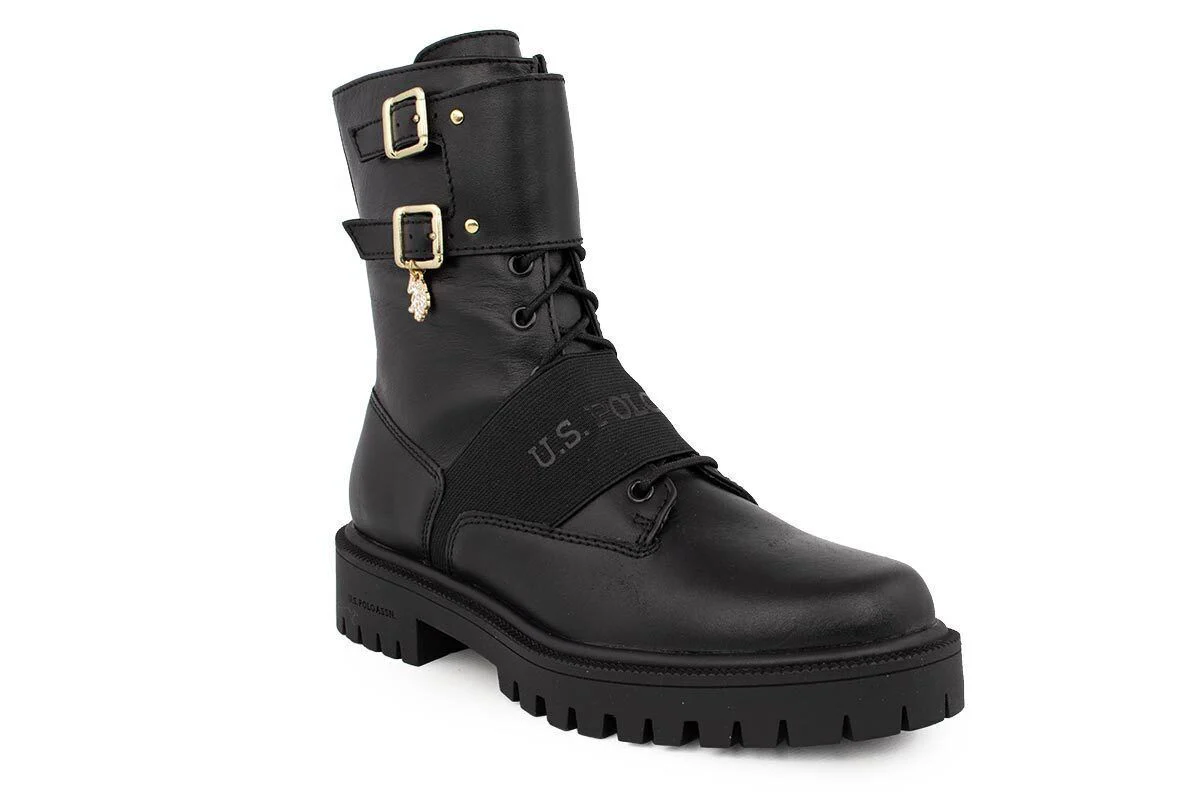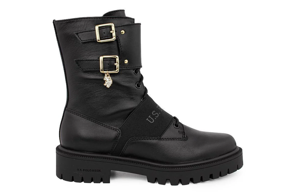 Realizzati in ecopelle di alta qualitร , presentano una suola carrarmato antiscivolo che offre stabilitร e grip ottimali in ogni situazione. Il design si distingue per le doppie fibbie dorate sul gambale, arricchite da un ciondolo decorativo con logo, e da una fascia elastica laterale con scritta โU.S. POLO ASSN.โ in rilievo per una calzata avvolgente e moderna.