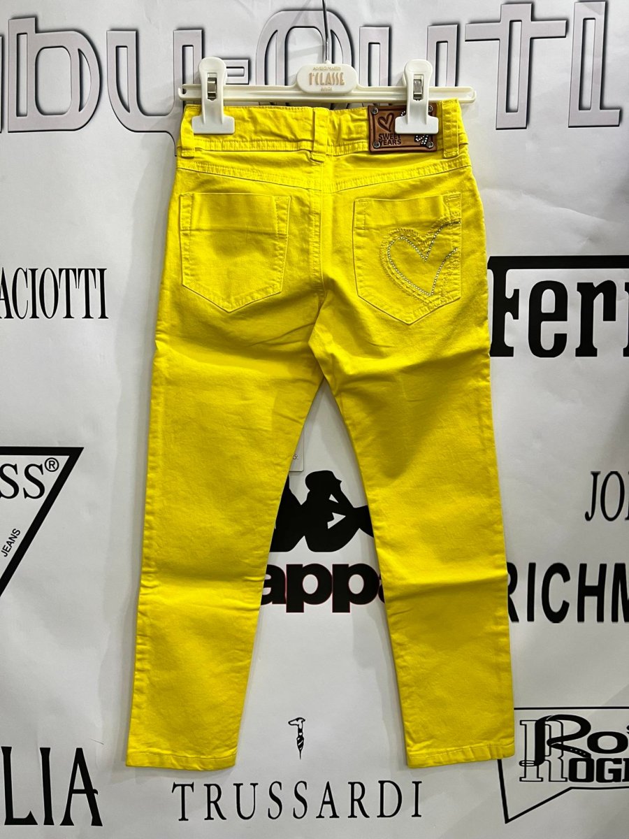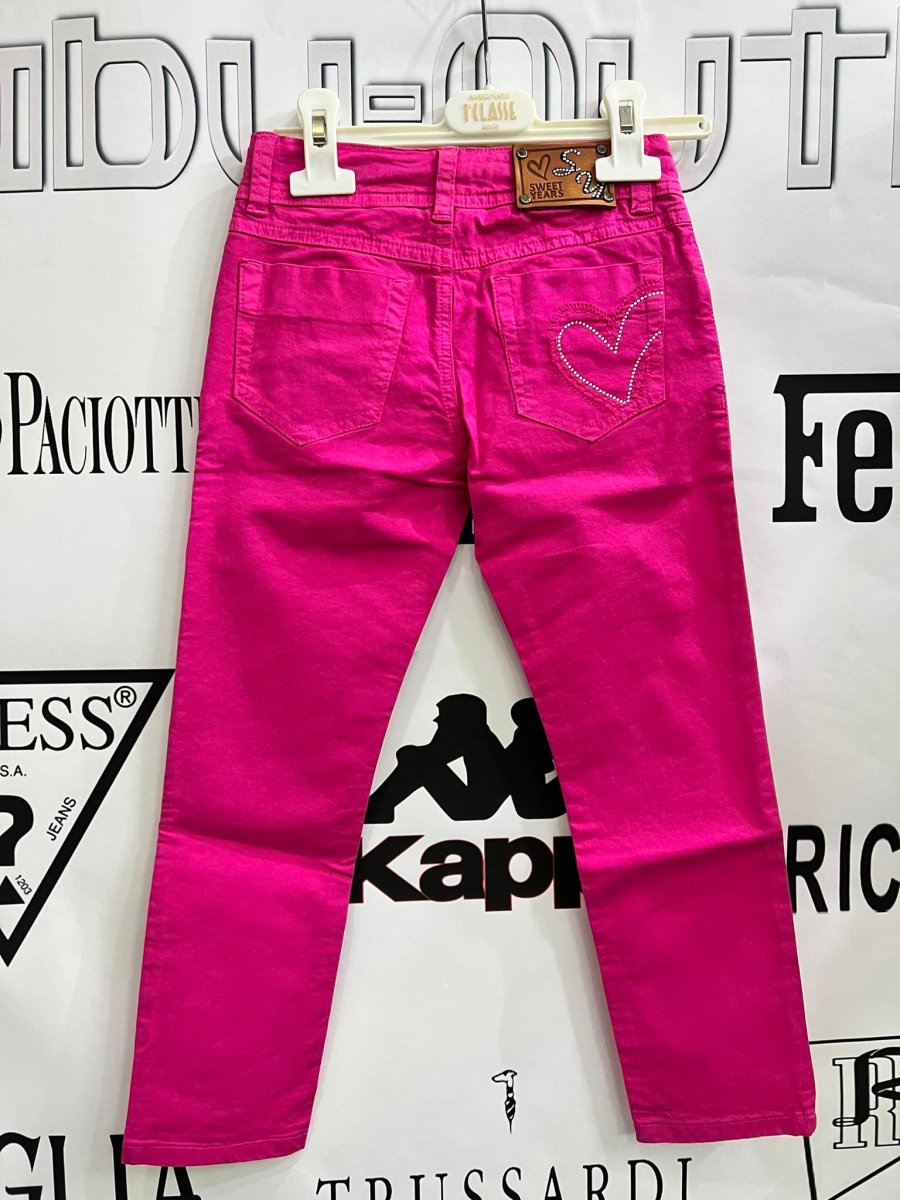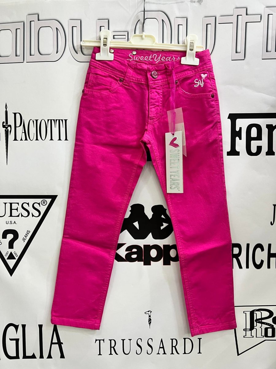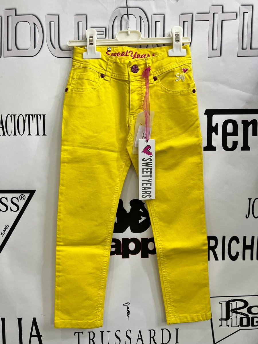 SWEET YEARS PANTALONE BAMBINA SWEET YEARS PANTALONE BAMBINA/RAGAZZA lungo chiusura con zip e bottone, elastico all’interno per stringere. modello slim-fit. quattro tasche. logo nel taschino e sul retro con strass. colore:ย giallo, biancoย o fucsia Taglia: 3 anni e 8 anni Composizione: 98% cotone, 2% elastico