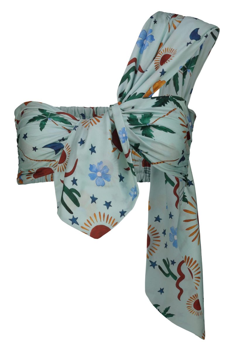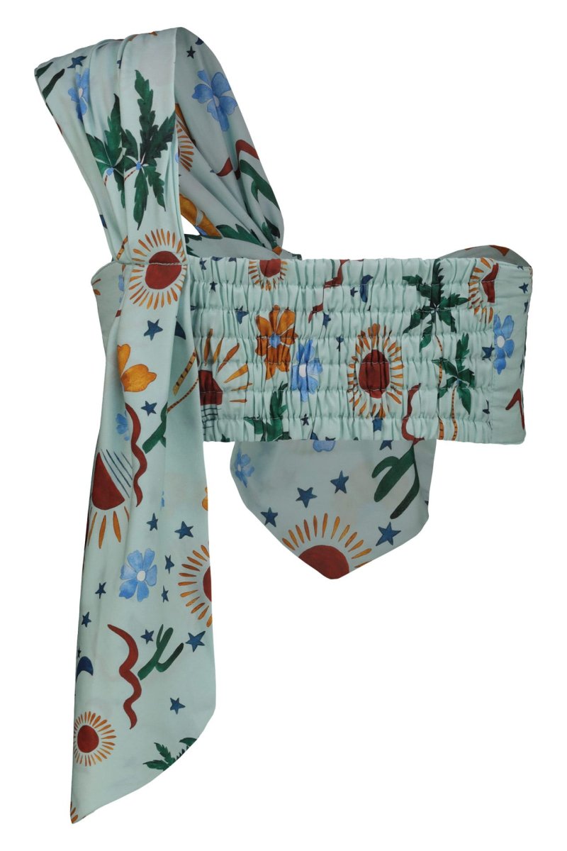 Questo top monospalla รจ un capo di abbigliamento femminile che combina eleganza e modernitร . Realizzato con un tessuto leggero e confortevole, presenta una stampa vivace dipinta a mano. La spallina larga si annoda al centro del busto, creando un effetto drappeggiato che aggiunge movimento e stile al capo. La parte inferiore del top lascia scoperti i lati della vita, conferendo un tocco sensuale e sofisticato, perfetto per le serate estive o per un look da giorno chic.