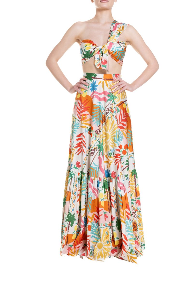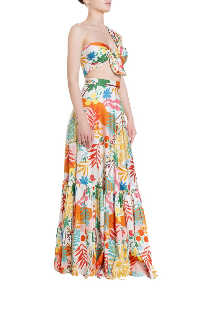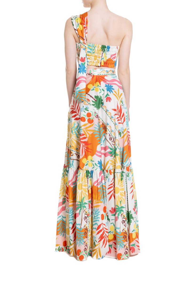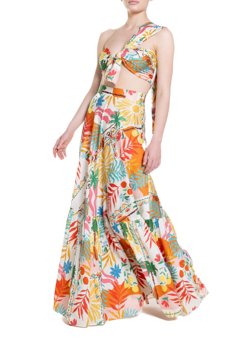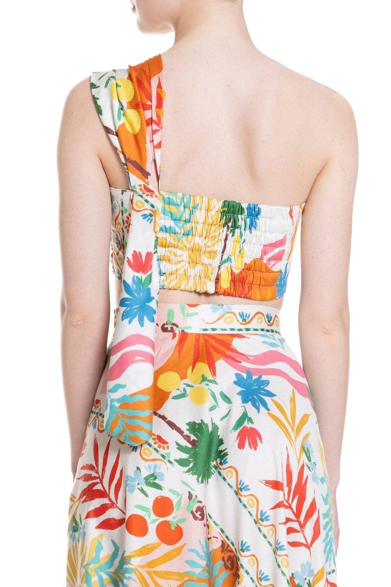 Questo top monospalla รจ un capo di abbigliamento femminile che combina eleganza e modernitร . Realizzato con un tessuto leggero e confortevole, presenta una stampa vivace dipinta a mano. La spallina larga si annoda al centro del busto, creando un effetto drappeggiato che aggiunge movimento e stile al capo. La parte inferiore del top lascia scoperti i lati della vita, conferendo un tocco sensuale e sofisticato, perfetto per le serate estive o per un look da giorno chic.