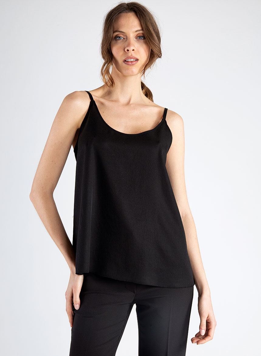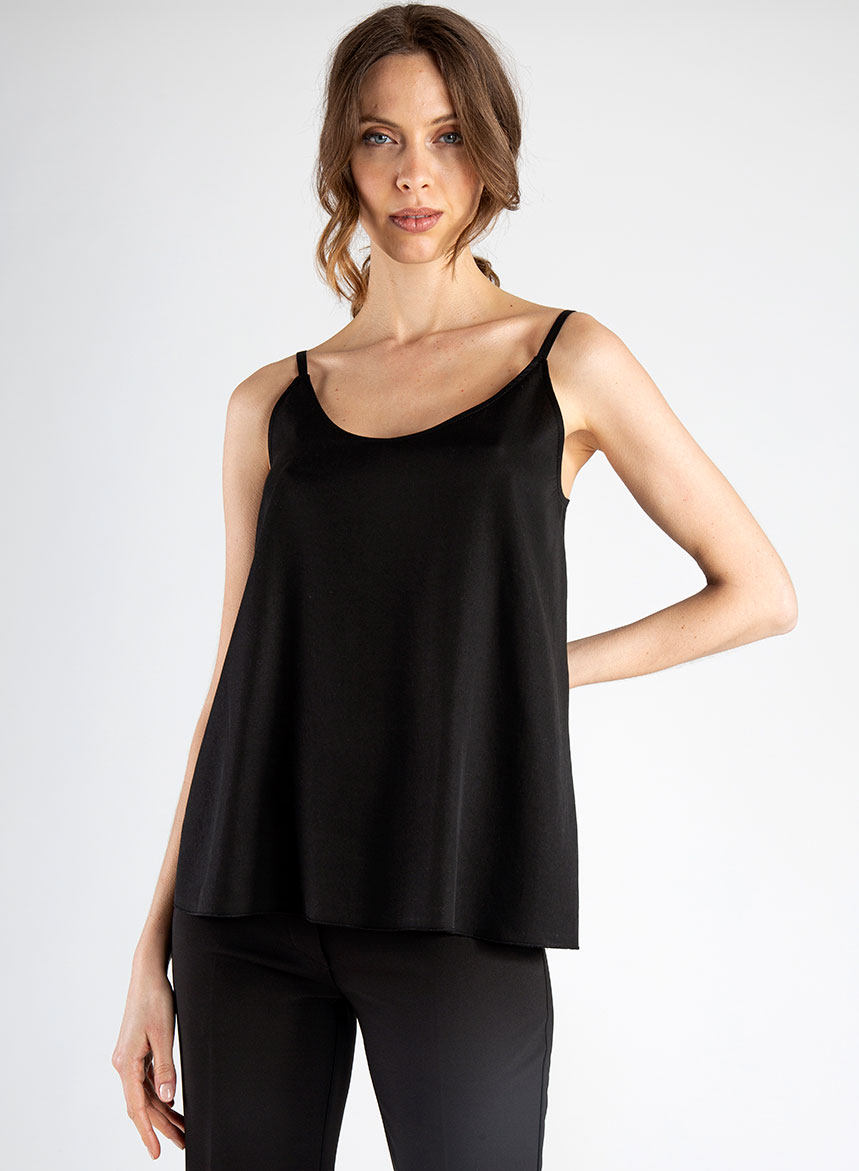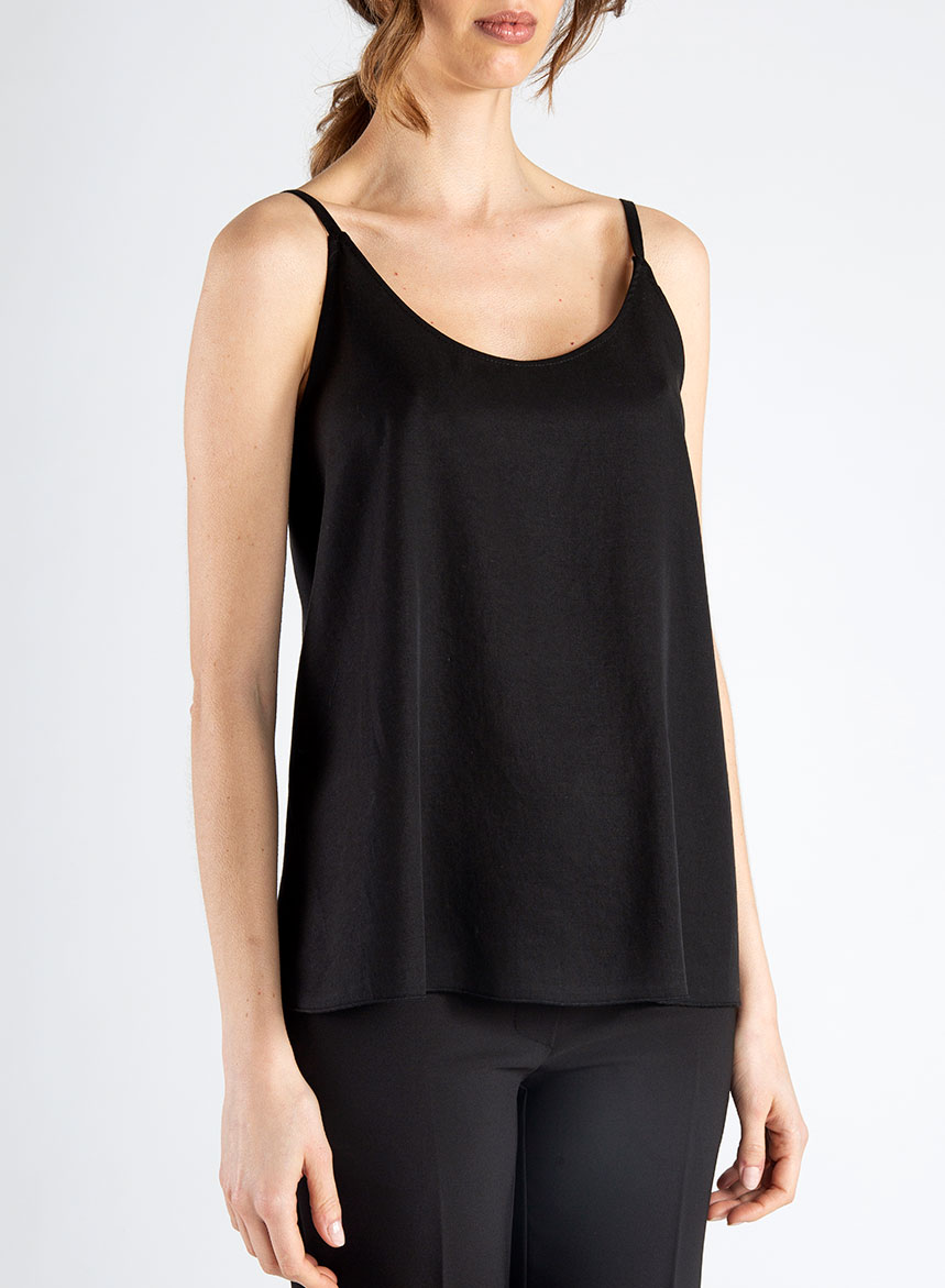 Top fluido smanicato con spalline sottili, in morbido Tencel di Viscosa. La modella รจ alta 176 cm e veste una tg 40.