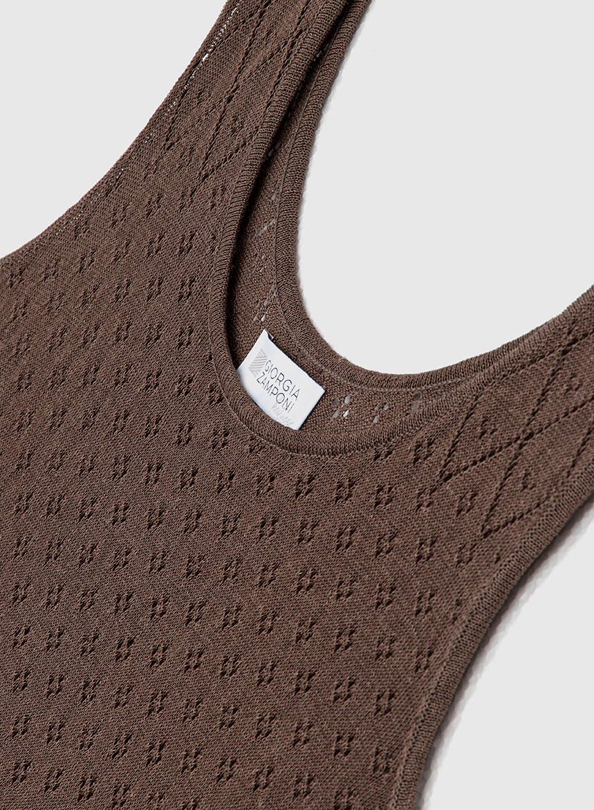 Top di maglia traforata in Lino dalla vestibiliร comfort. Smanicato con scollo ampio a giro. Il filato utilizzato per questo capo ha certificazione Oeko-Texยฎ, che garantisce che i prodotti tessili siano privi di sostanze tossiche per la salute umana l’ambiente, nel rispetto di condizioni di lavoro sicure e salutari.
