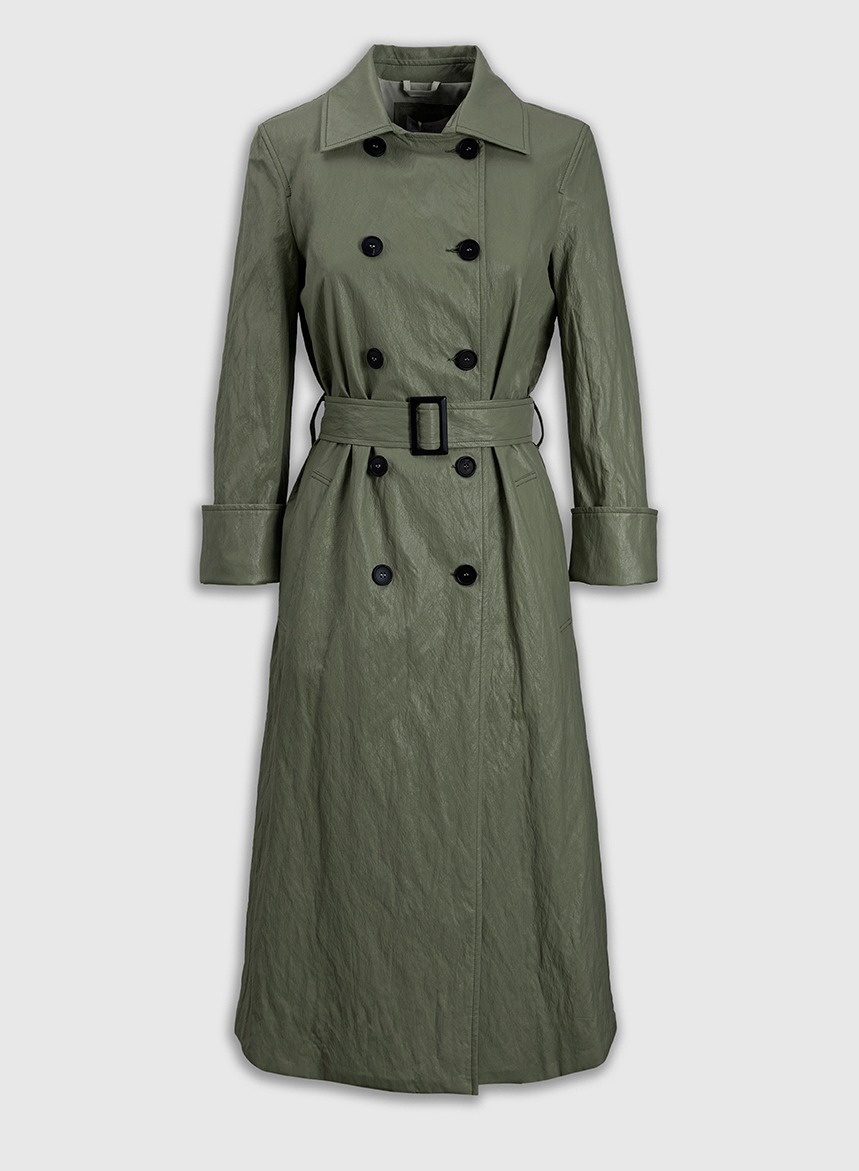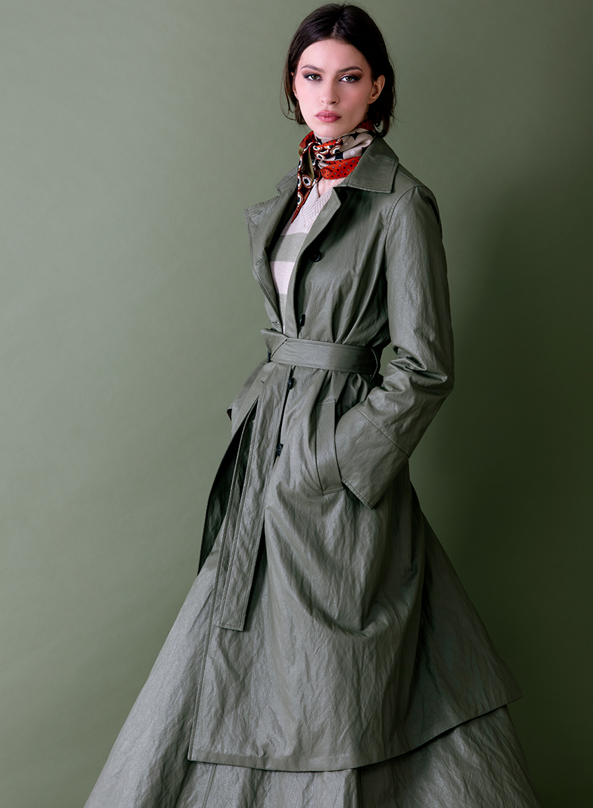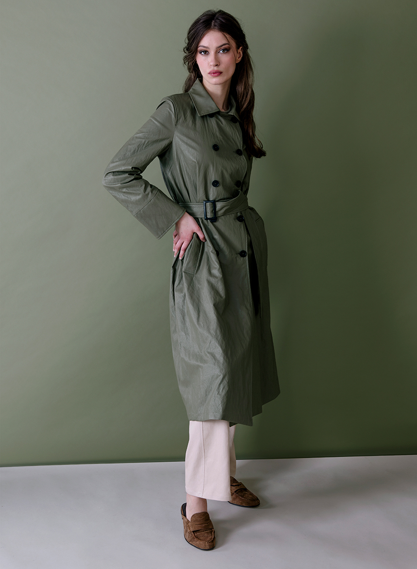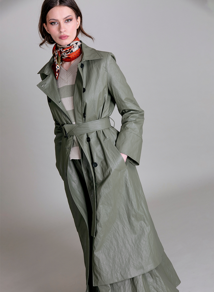 Trench lungo in Viscosa e tessuto spalmato effetto pelle. Chiusura doppiopetto con bottoni. Collo a camicia, tasche applicate e spacco sul retro. Cintura in coordinato. Capo foderato. La modella รจ alta 175 cm e indossa una taglia 40ยฐ.