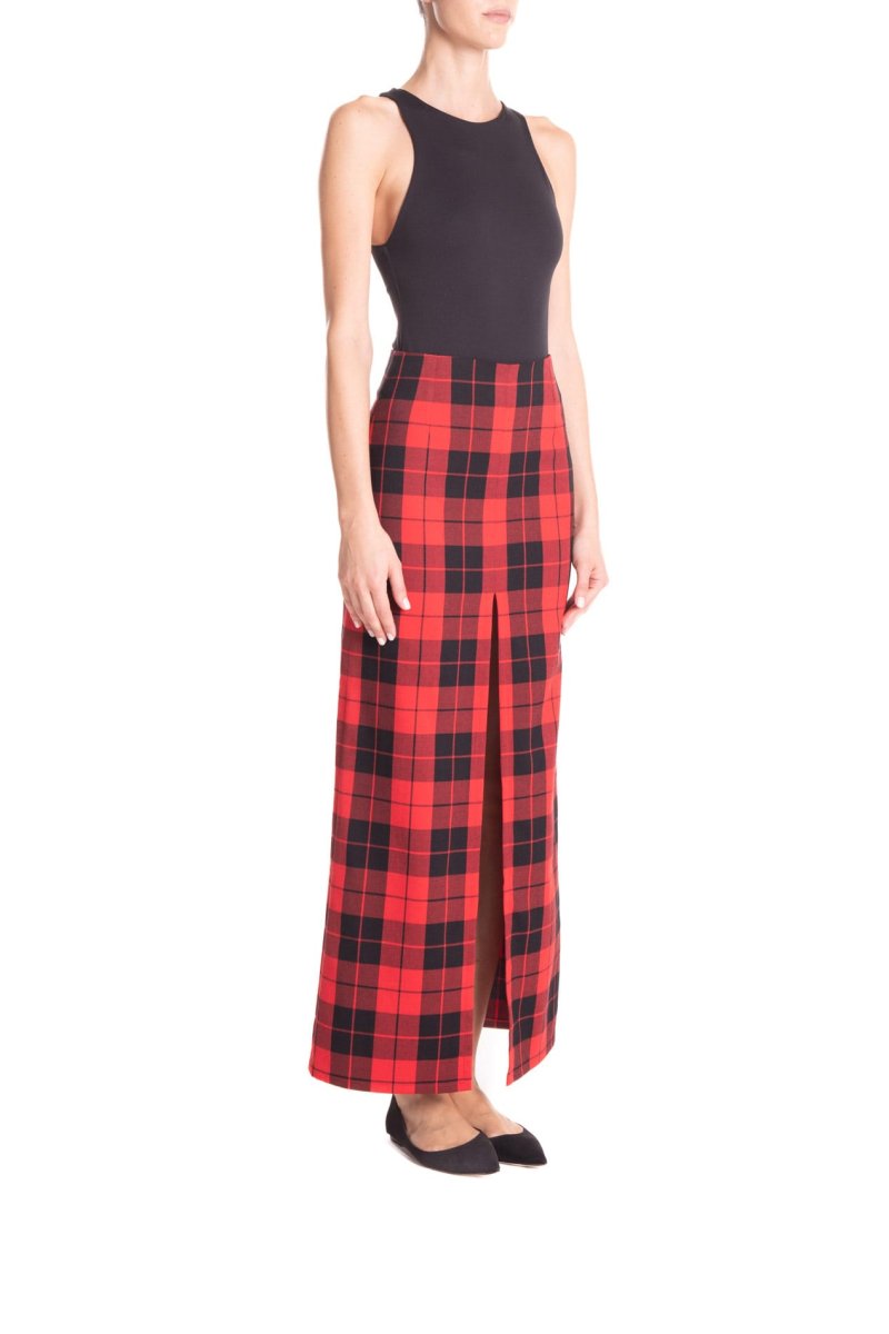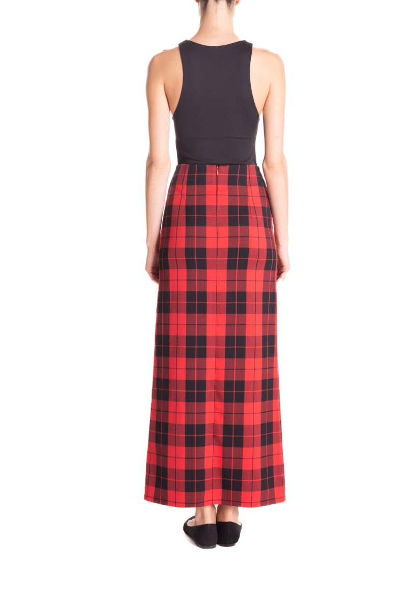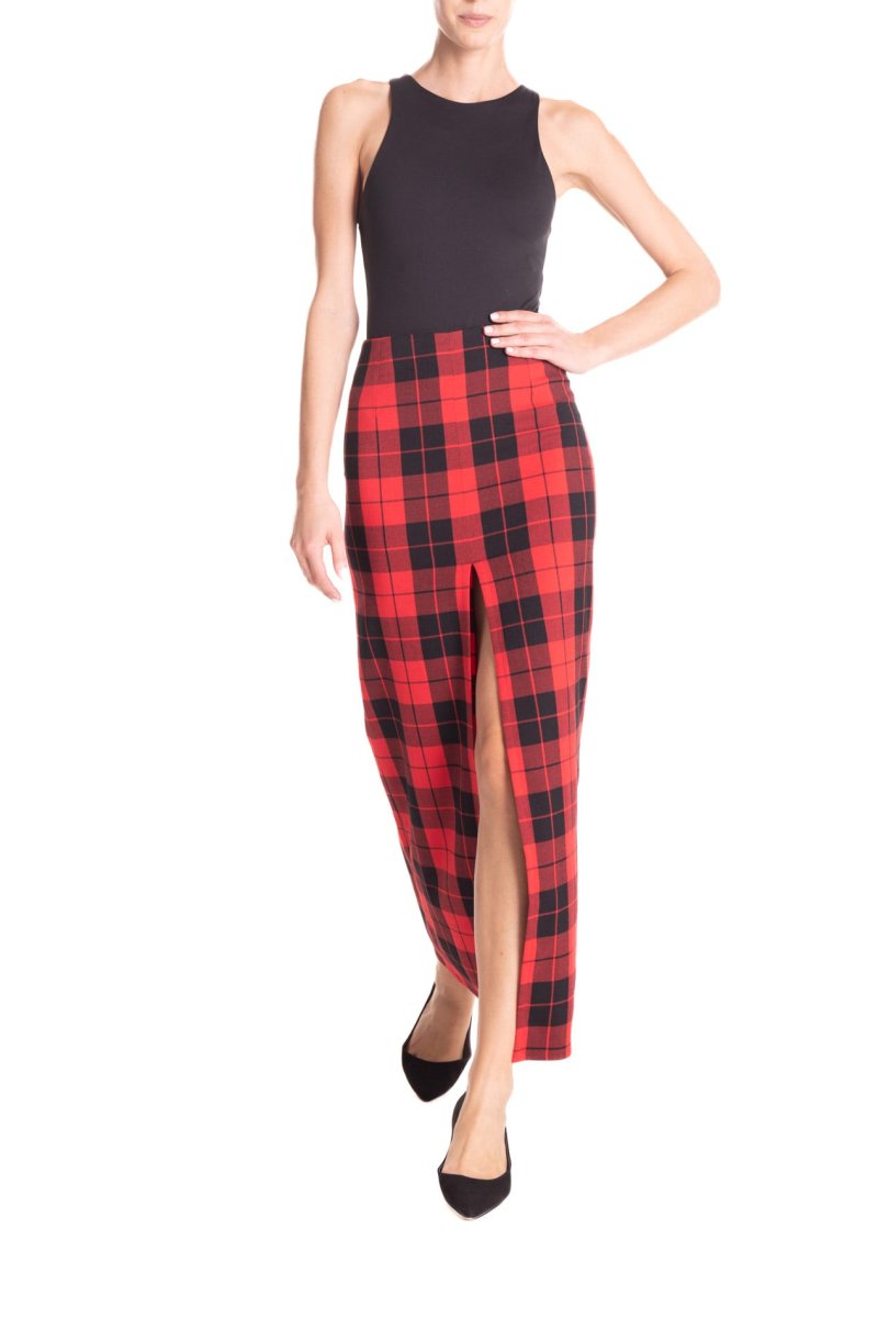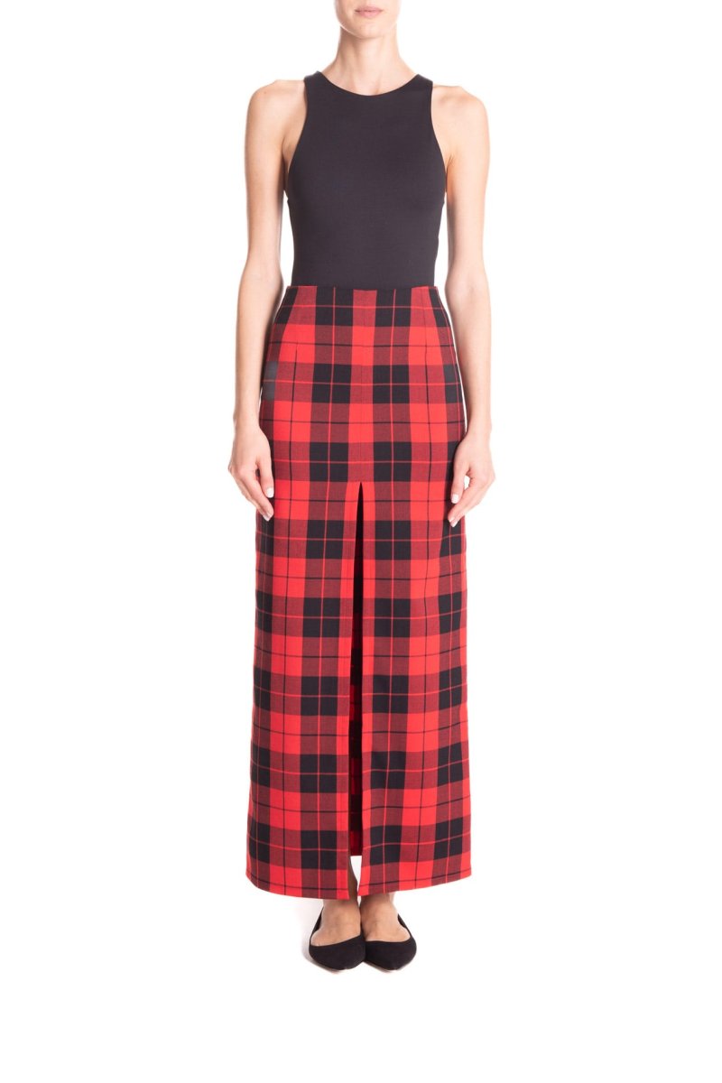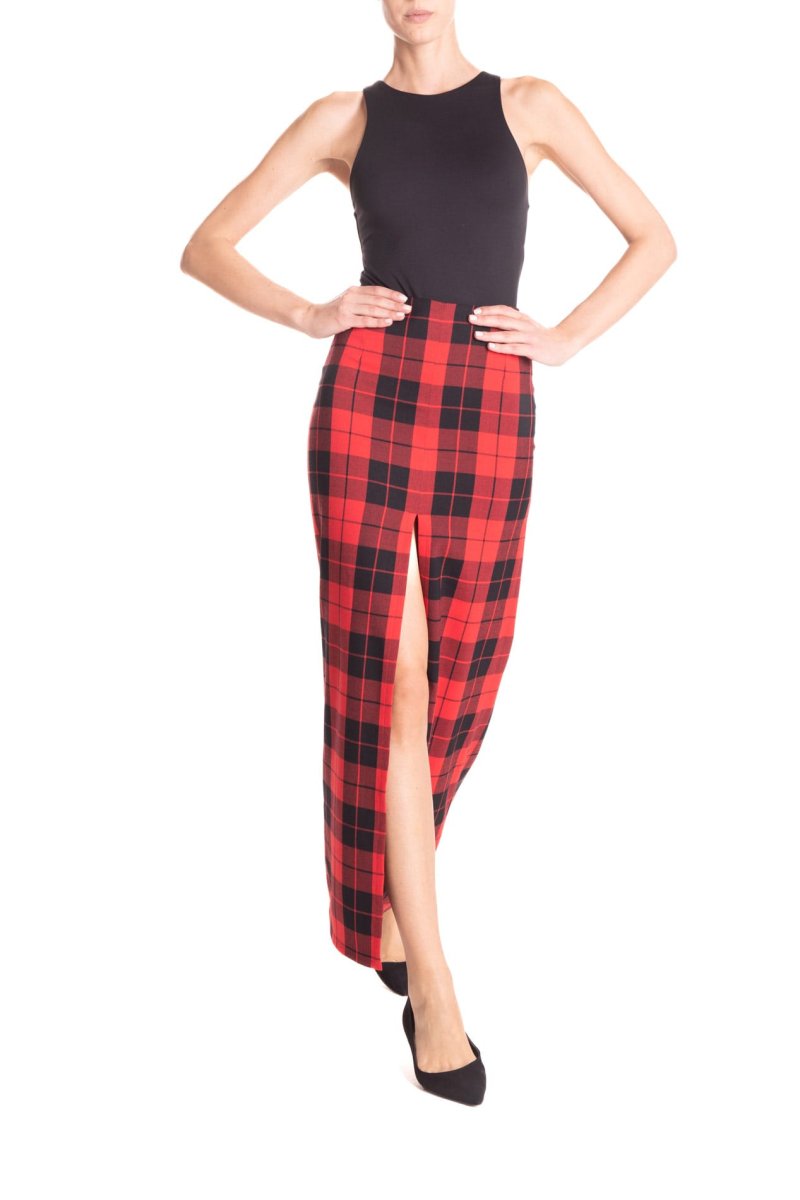 Gonna lunga con spacco centrale, in tessuto scozzese a vita alta. โจCon un tacco o con una scarpa bassa, con una camicia o con un maglione, sarete sempre stiloseย ed uniche.