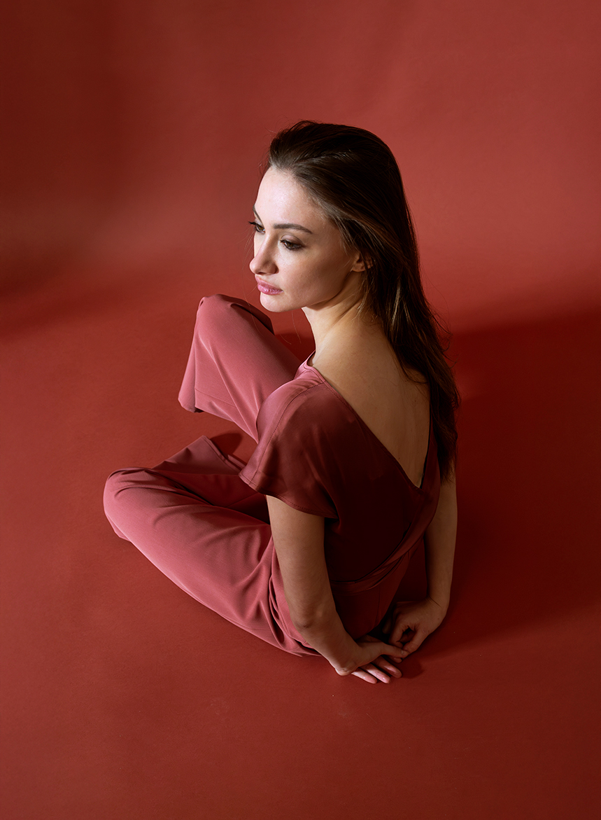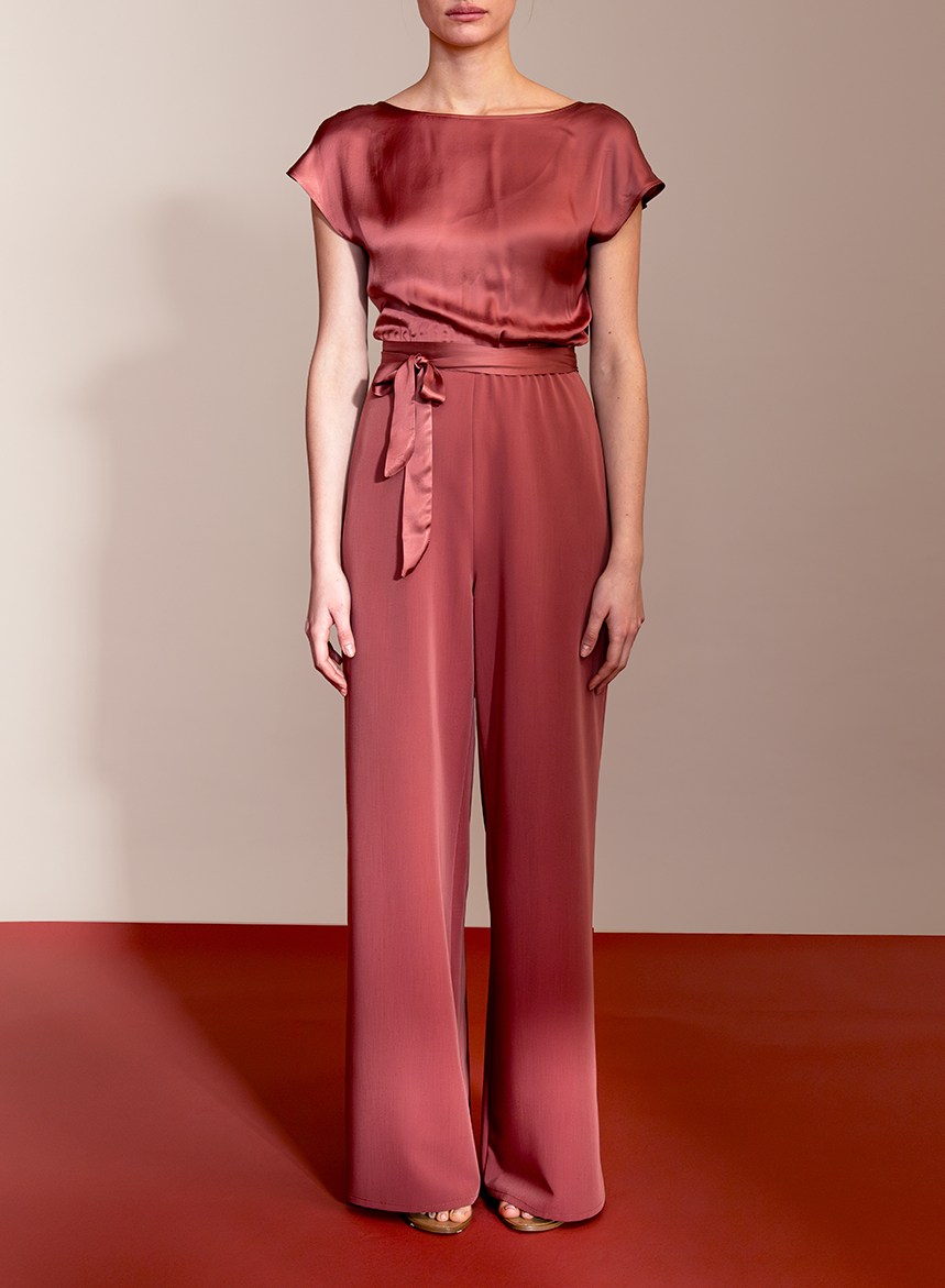Tuta fluida in gabardine stretch, gamba con linea a palazzo. Scollo a V incrociato sul retro con cintura e chiusura con zip invisibile. La modella รจ alta 175 cm e indossa una taglia S.