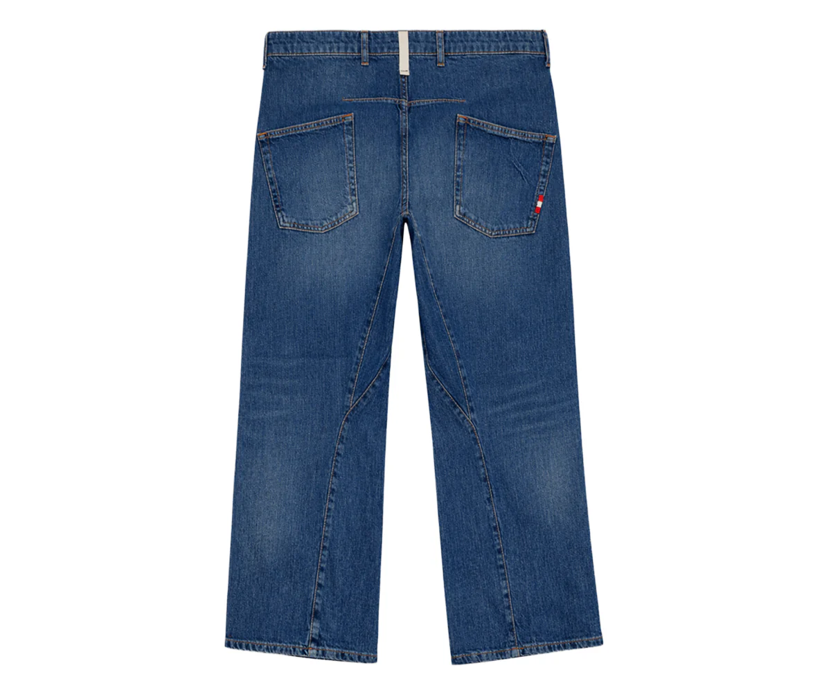 - Denim twist con lavaggio medio e impunture in contrasto.