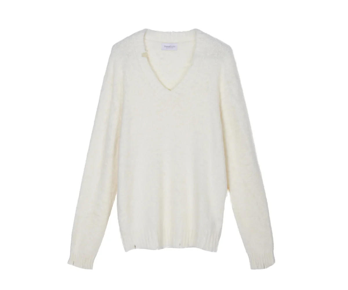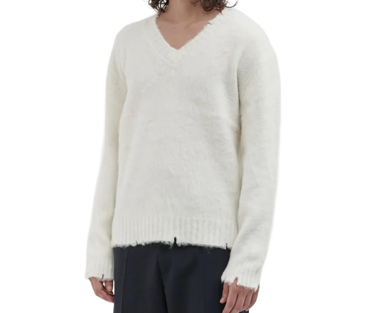 Scollo a V in filato misto alpaca con superficie garzata e dettagli di rottura.
